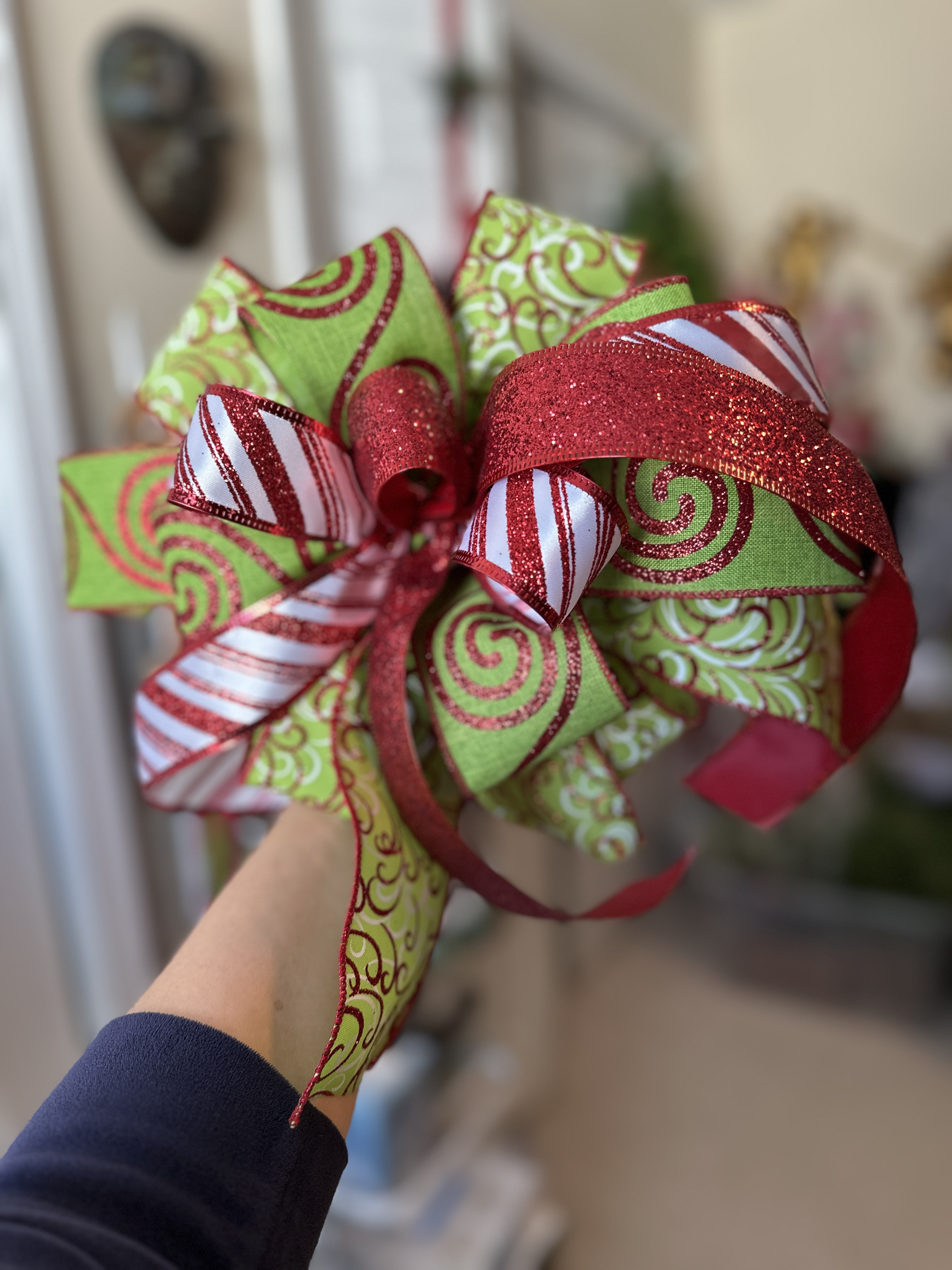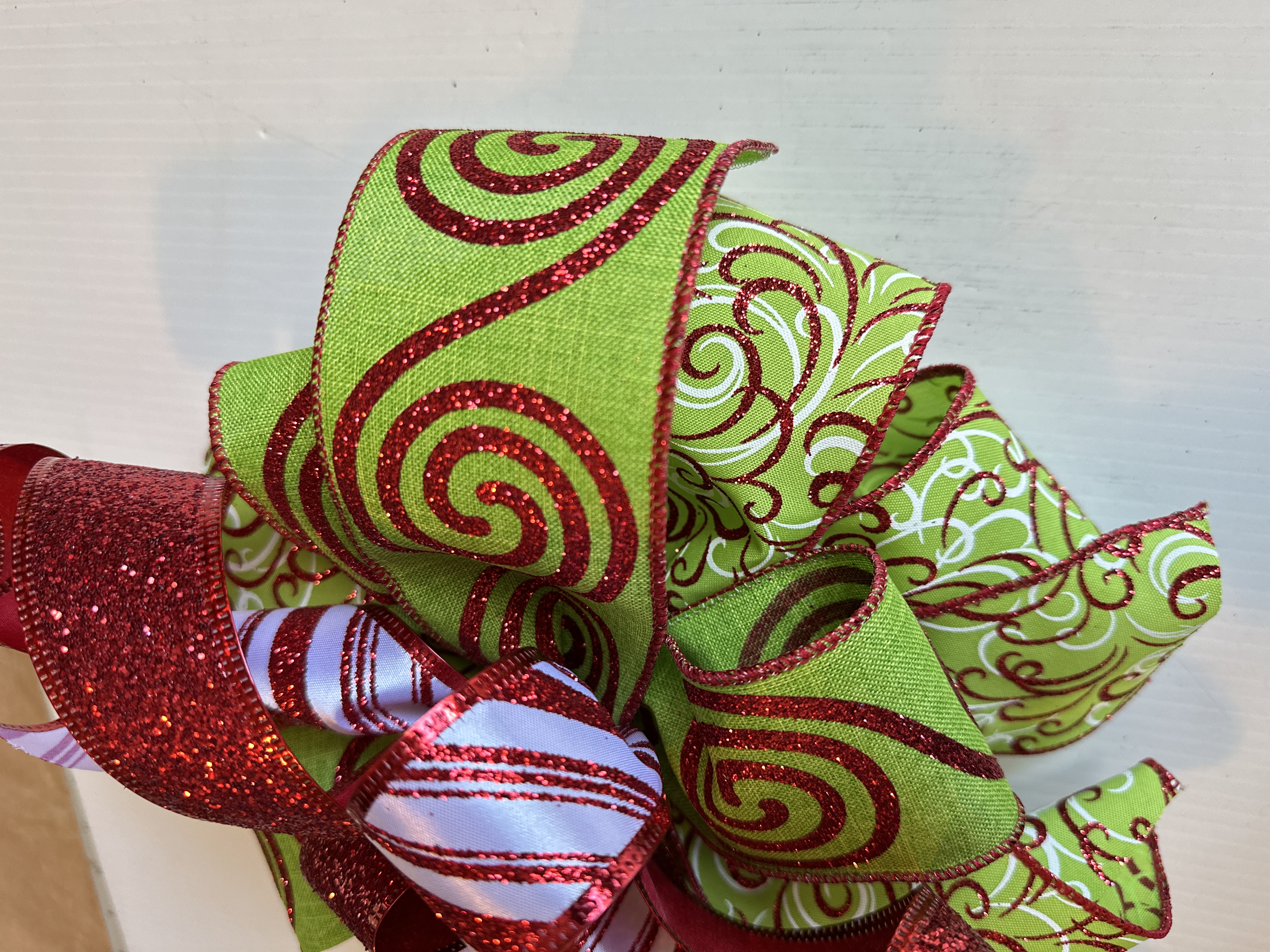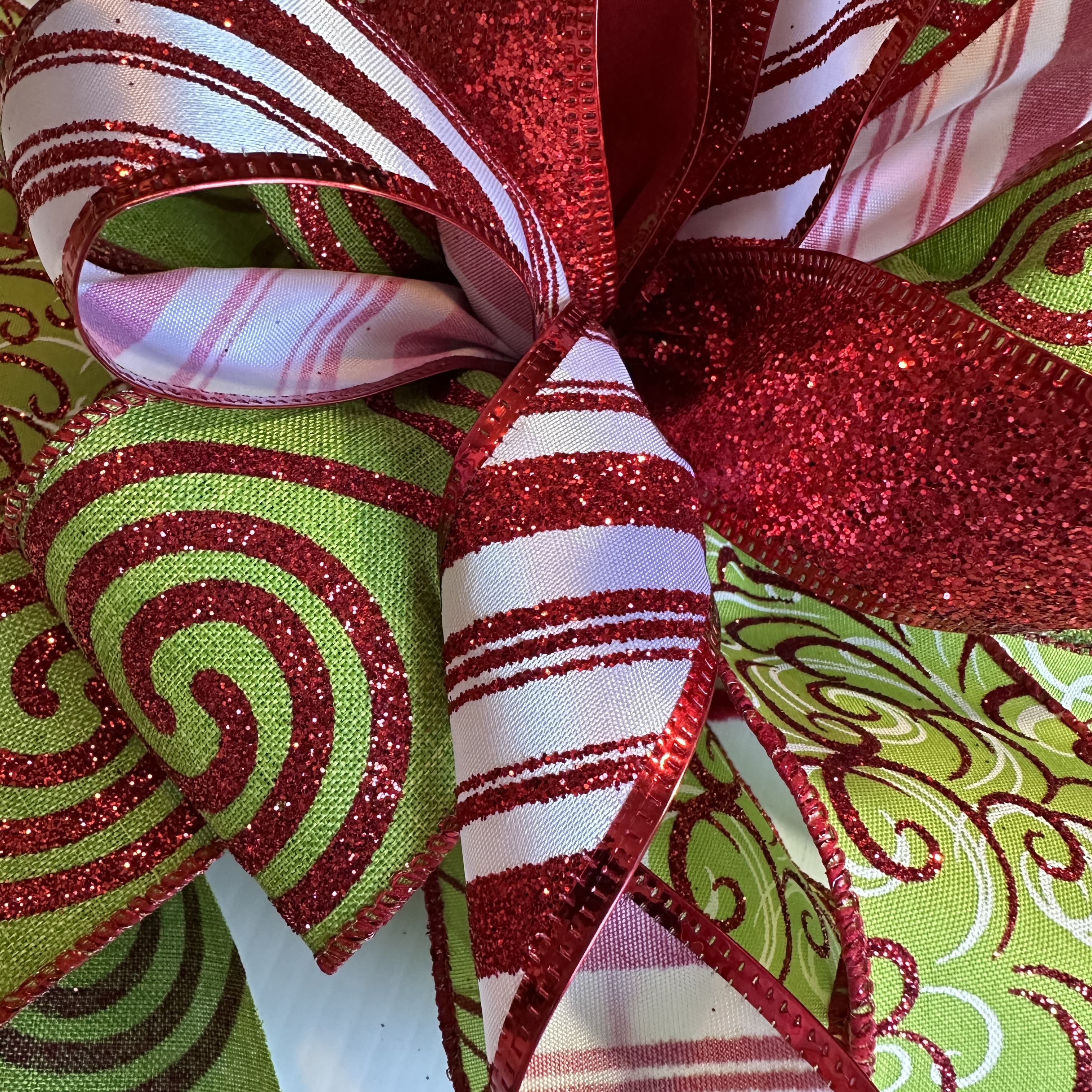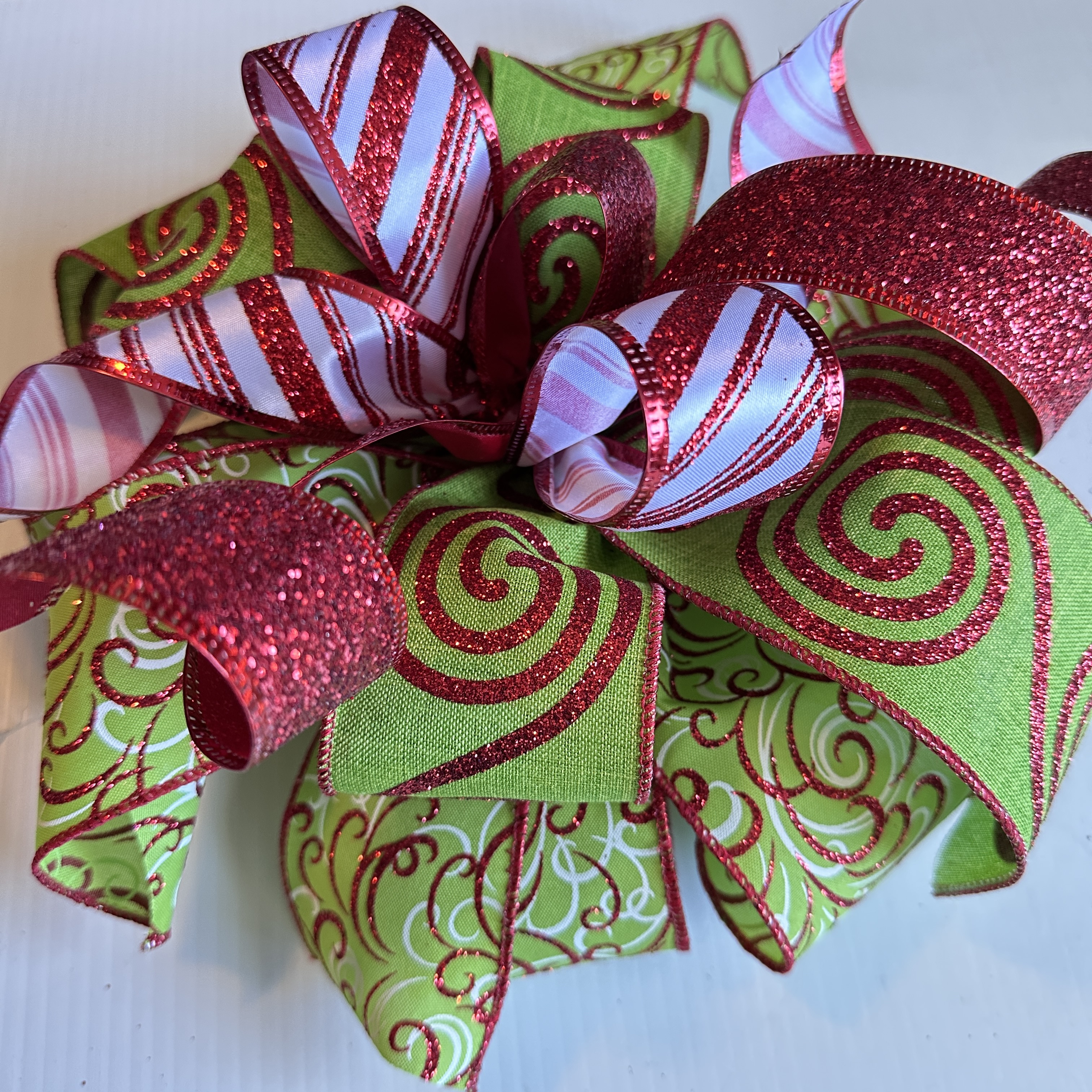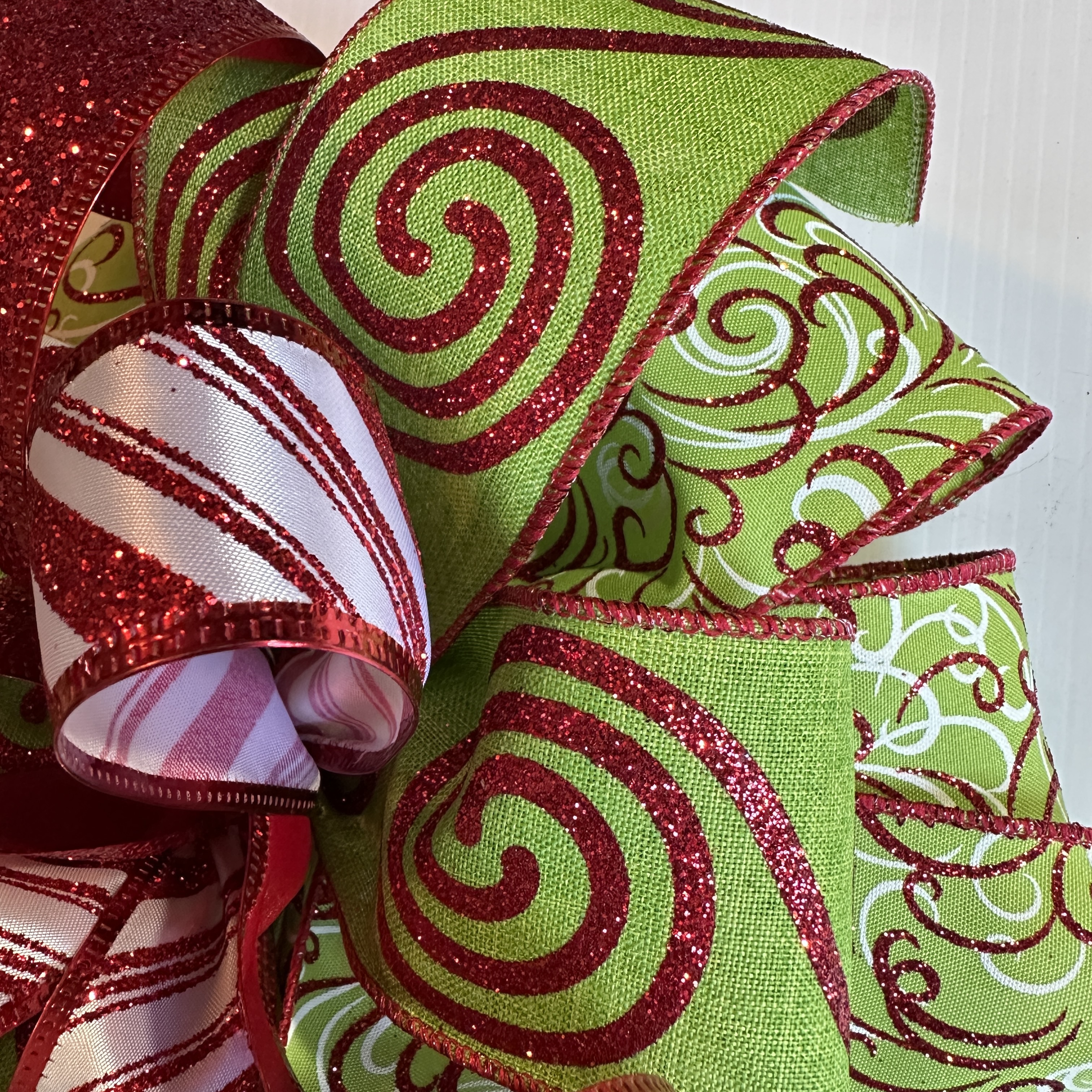 A festive handcrafted bow layered in sparkling red, peppermint stripes, and whimsical green swirls—perfect for adding a bright, joyful touch to wreaths, gifts, and holiday décor.