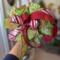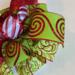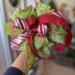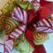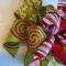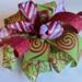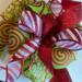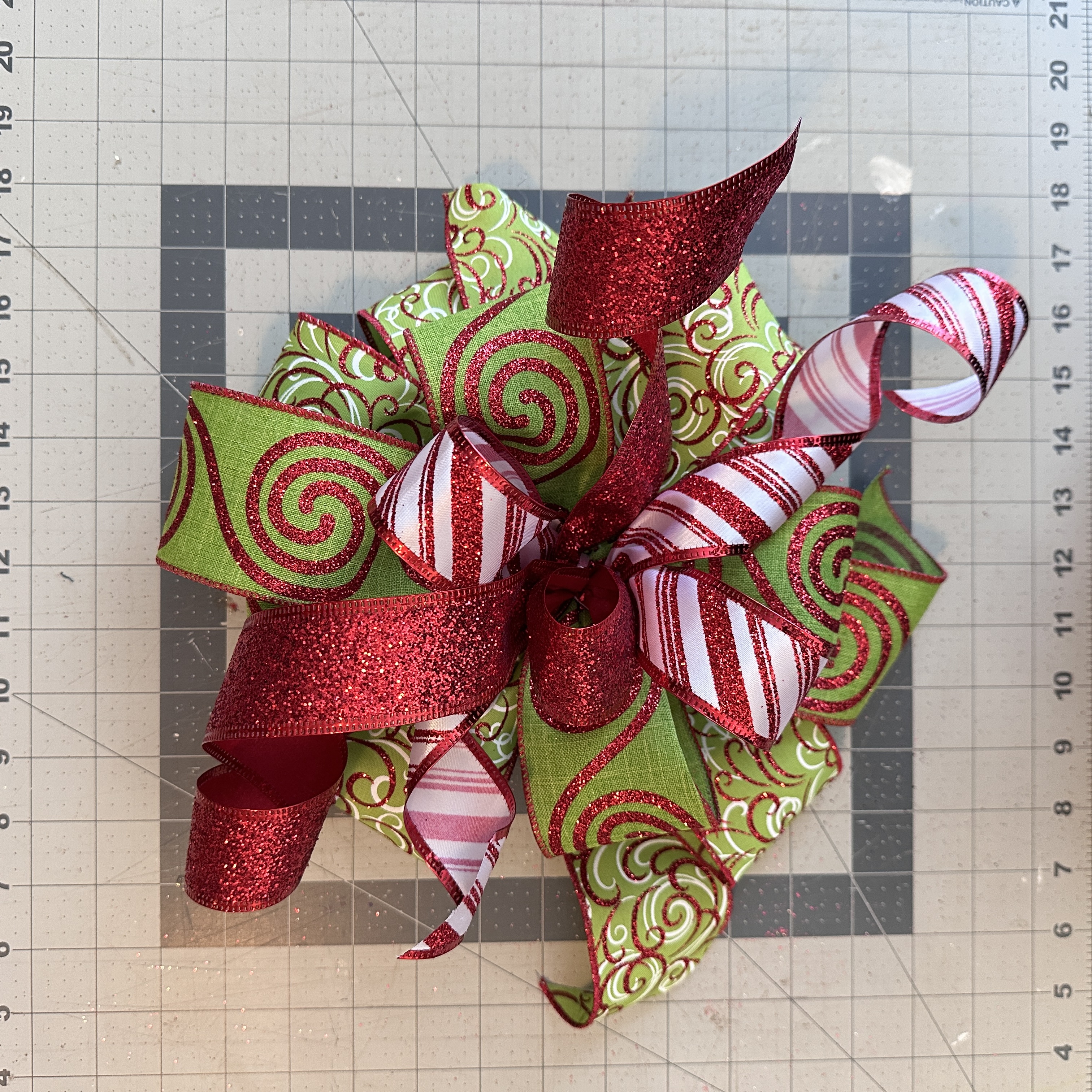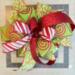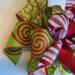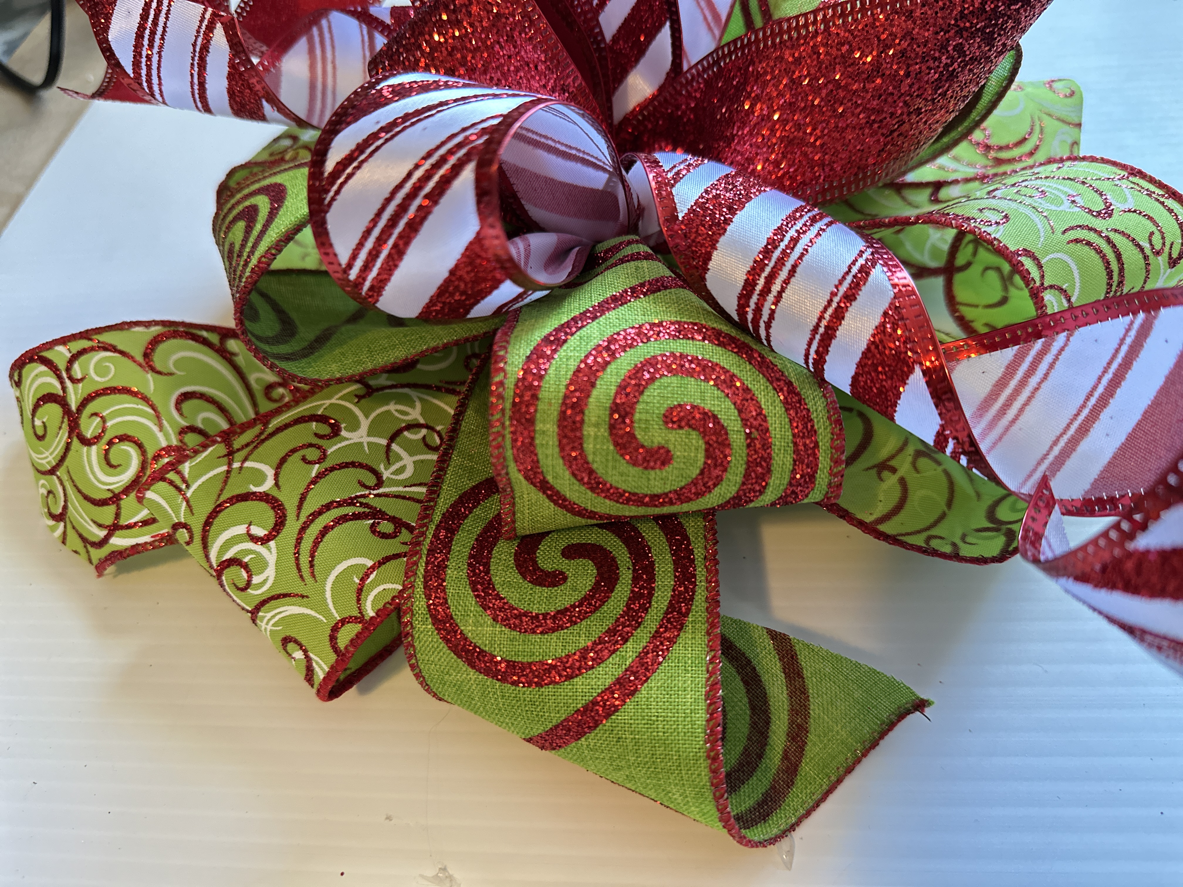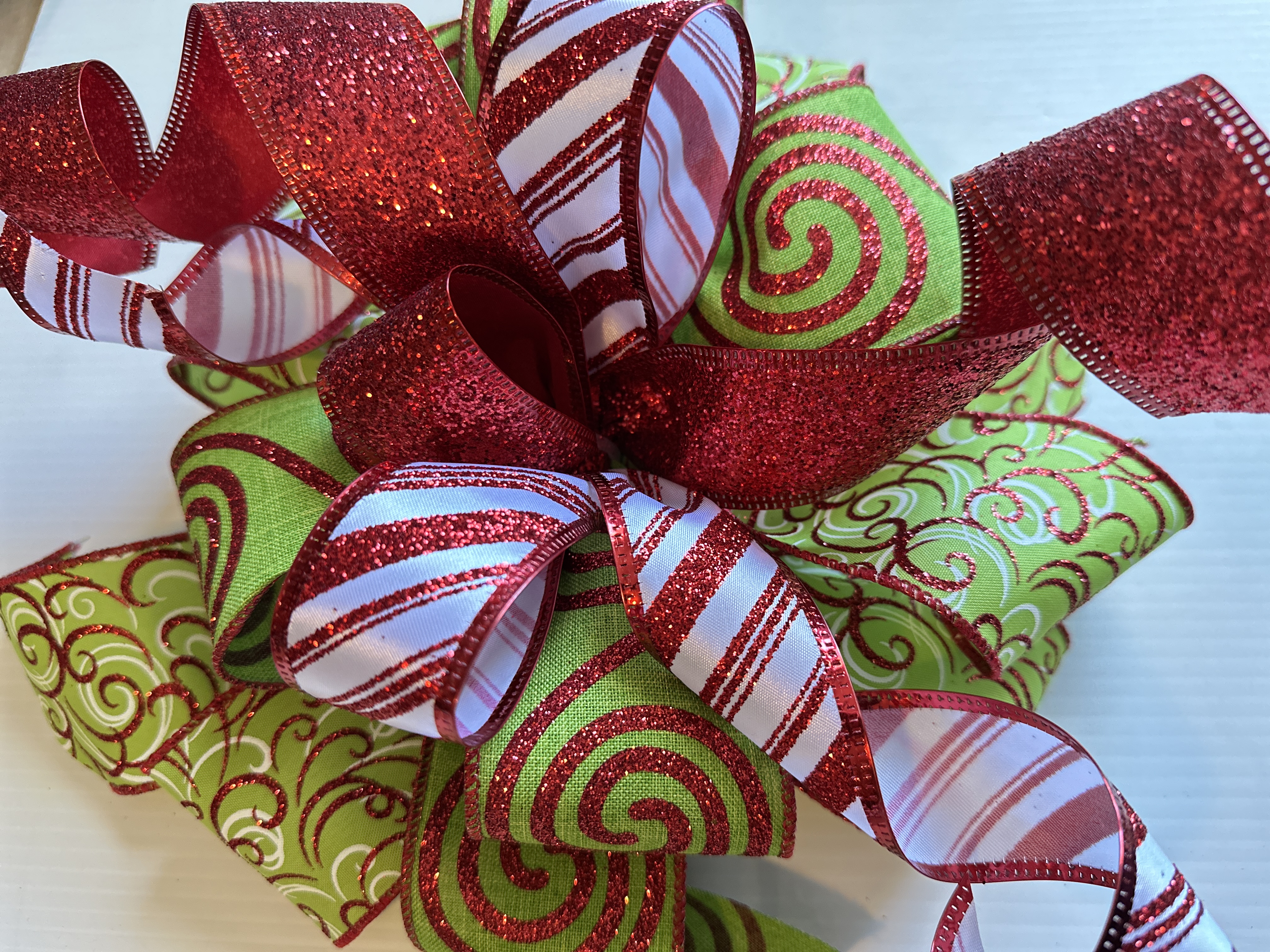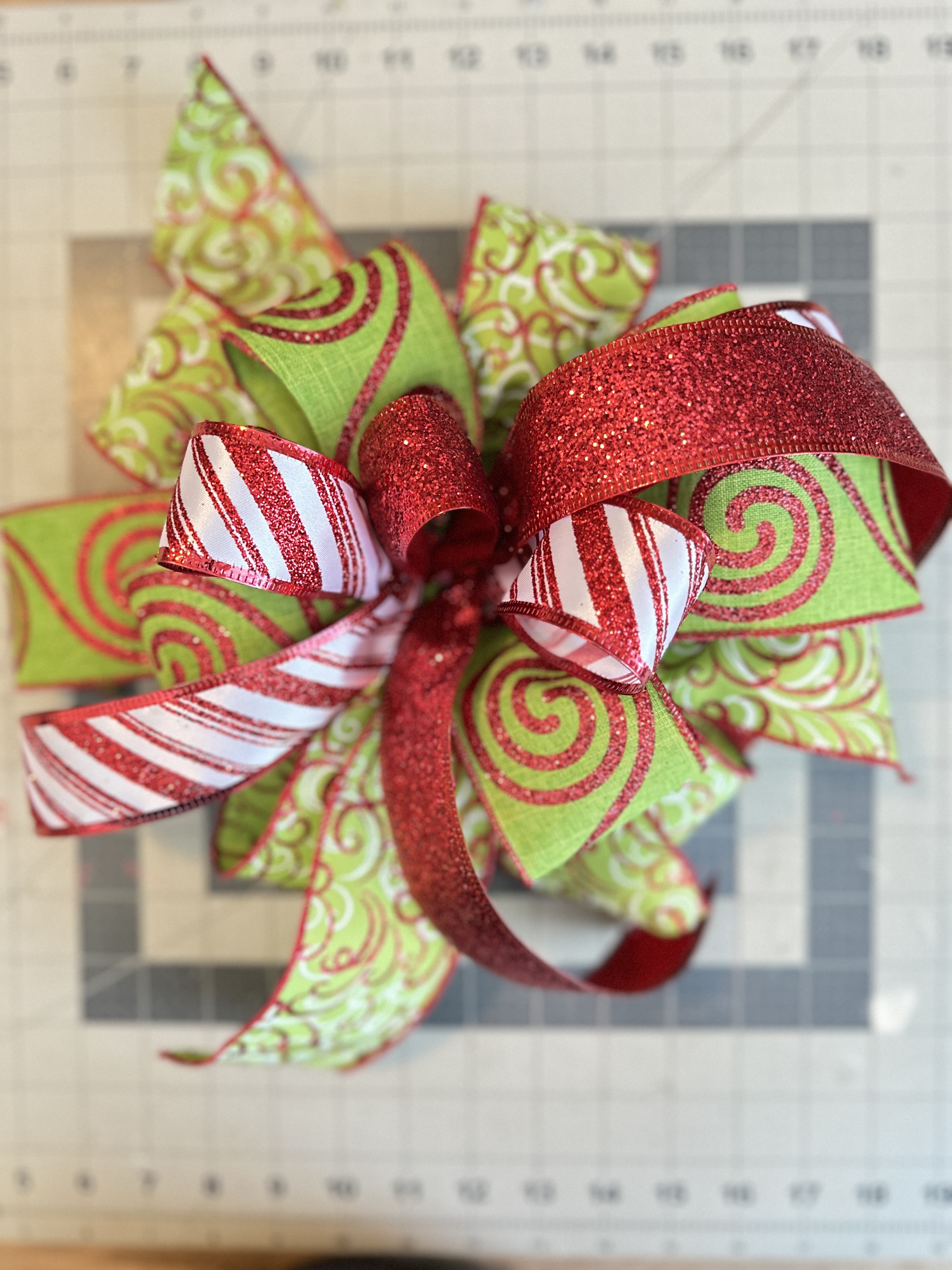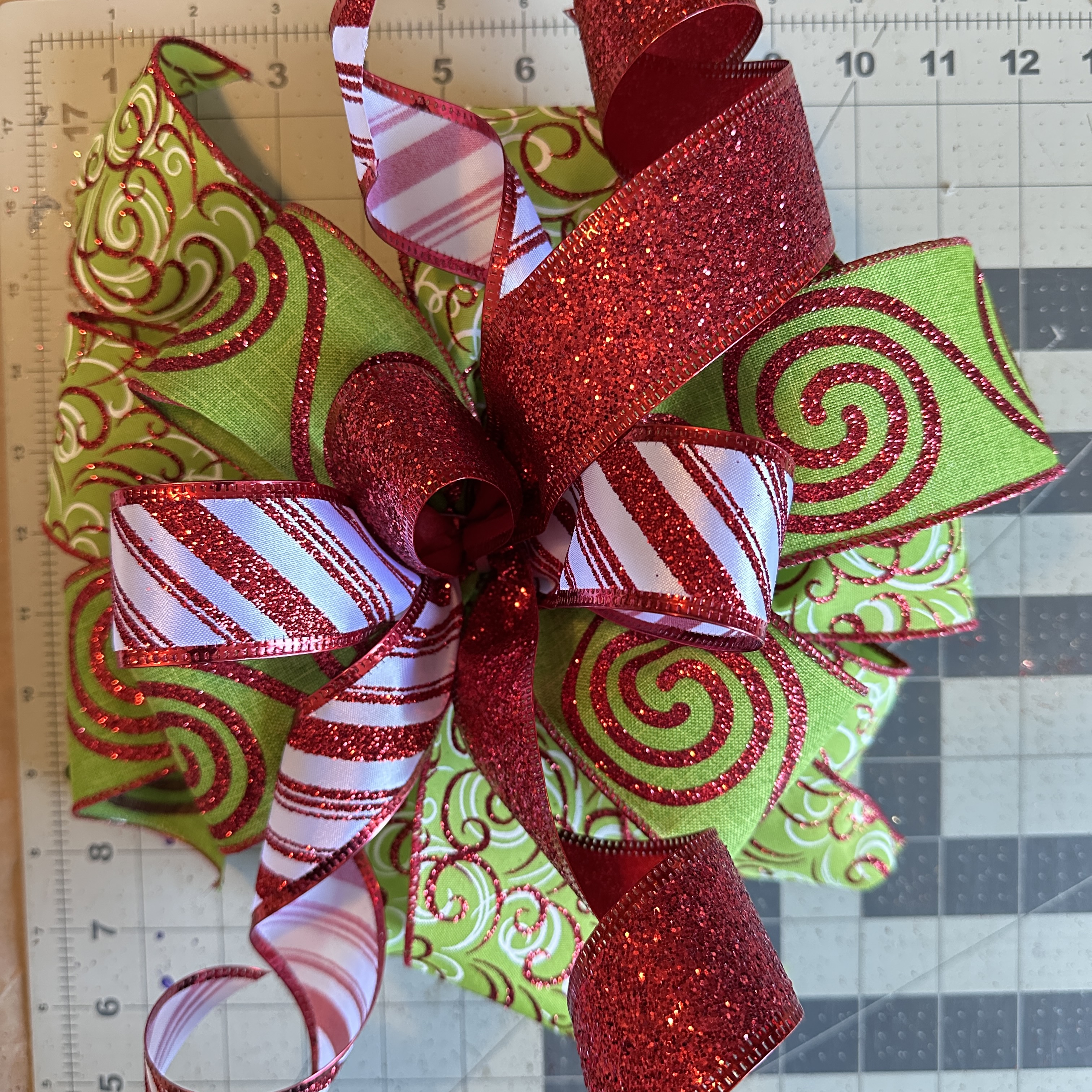 A festive handcrafted bow layered in sparkling red, peppermint stripes, and whimsical green swirls—perfect for adding a bright, joyful touch to wreaths, gifts, and holiday décor.