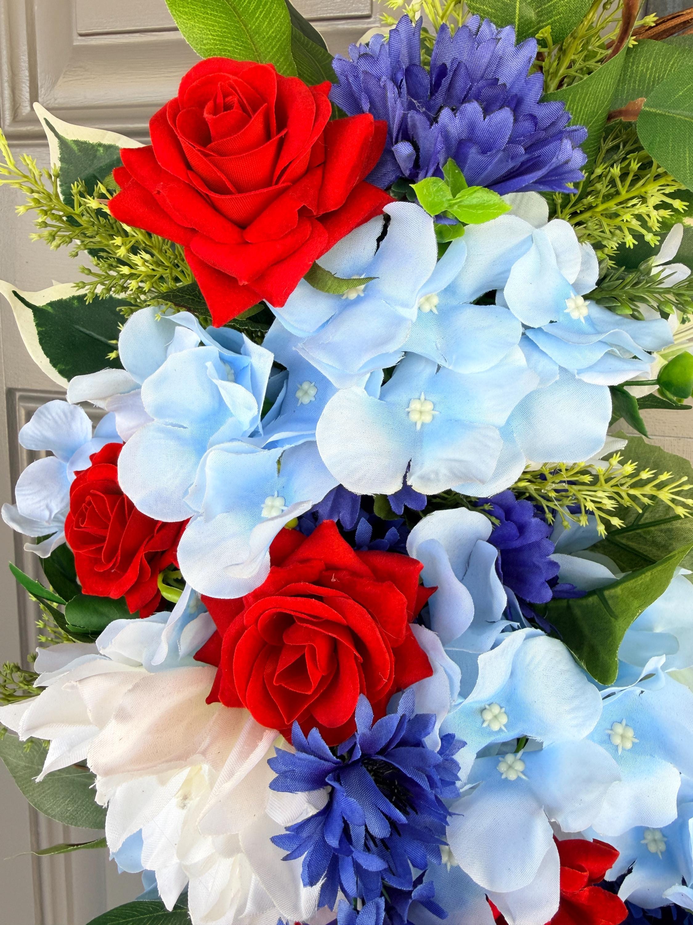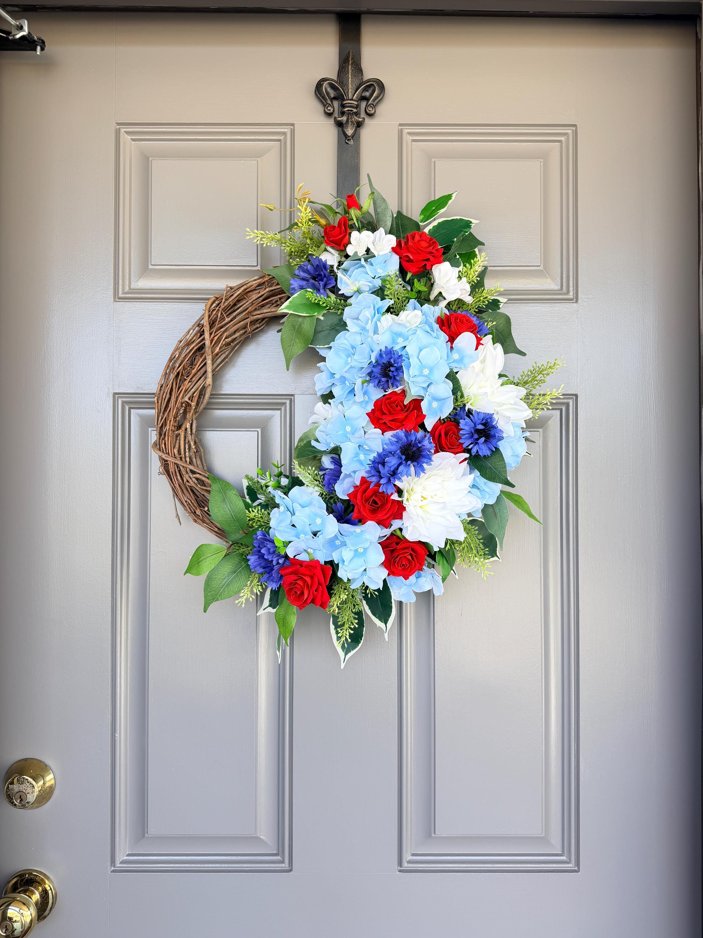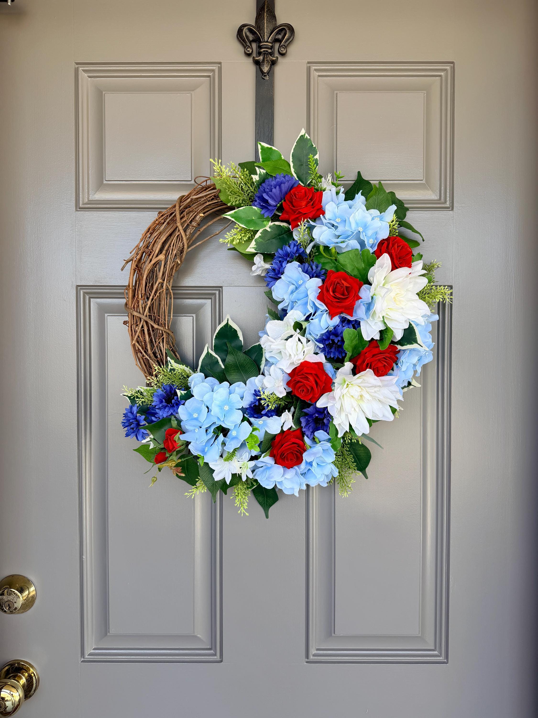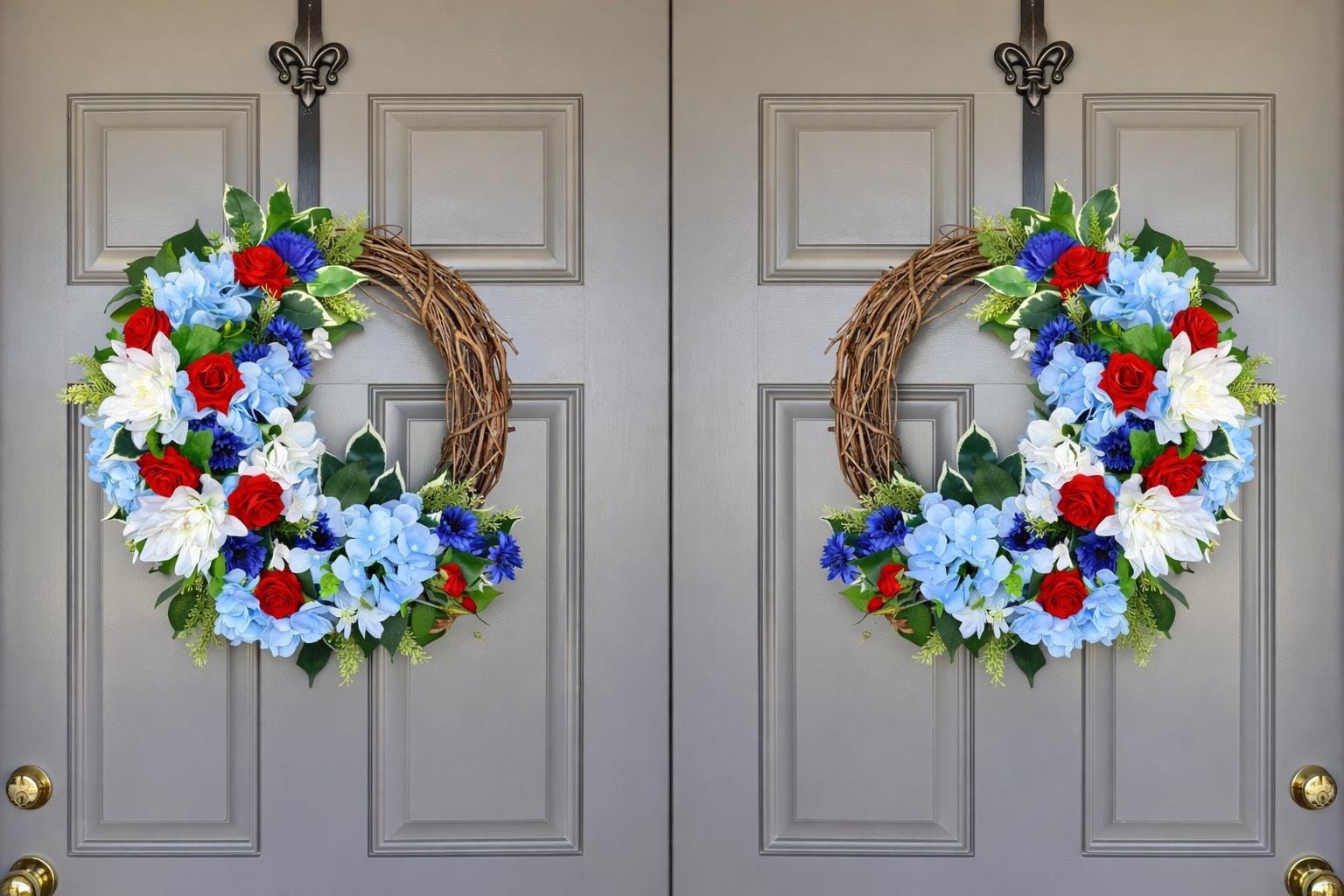 The patriotic red white and blue hydrangeas and roses wreath makes it ideal for summer styling, Memorial Day, Fourth of July, or year-round Americana décor, while its refined floral composition offers a soft, welcoming touch beyond the season. Measuring 21 inches across leaf tip to leaf tip (without bow) and 19 inches in height, and crafted on a 14 inch grapevine wreath. Includes UV treatment. Two available - order both for double door option.
