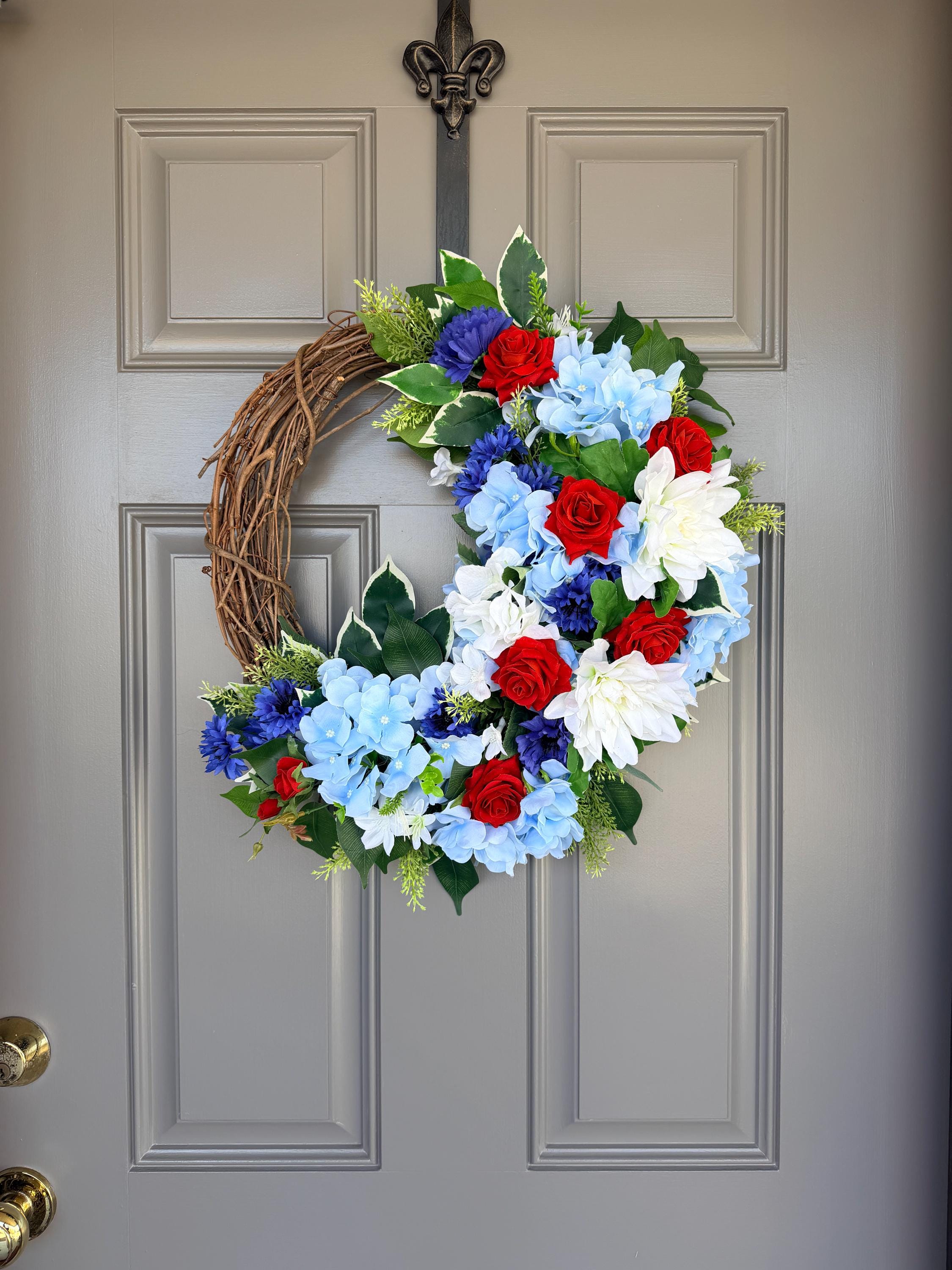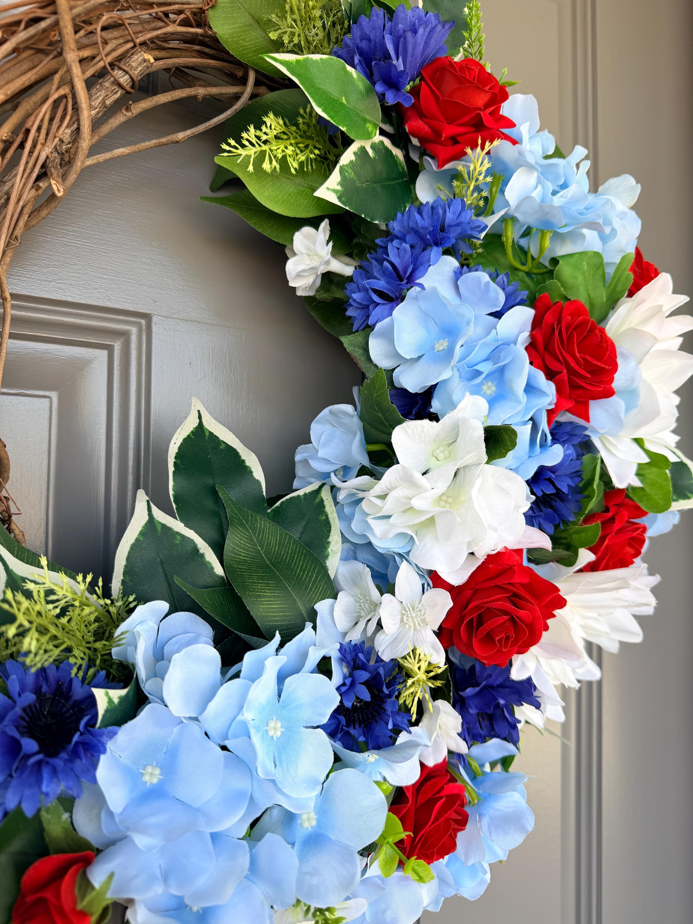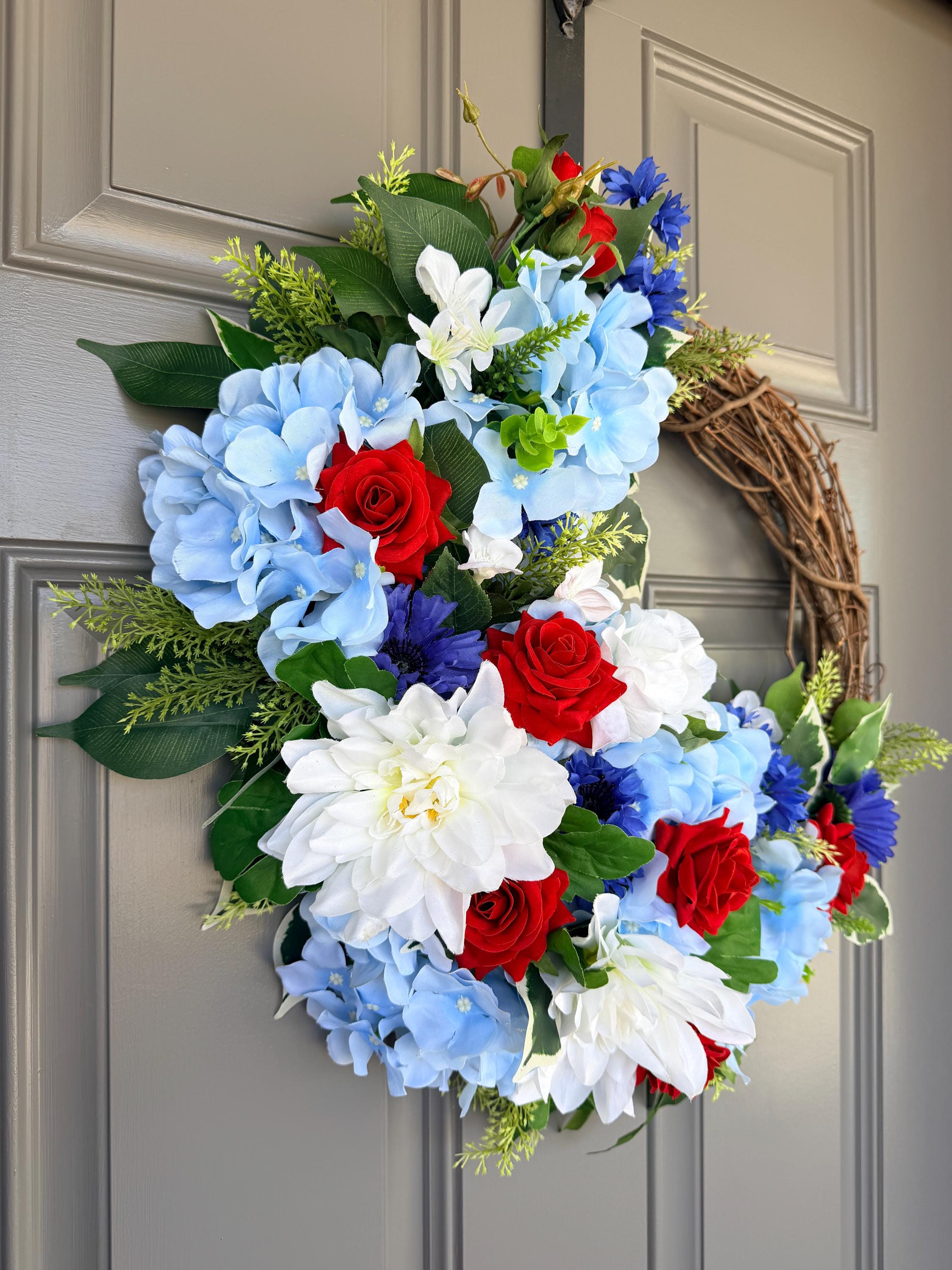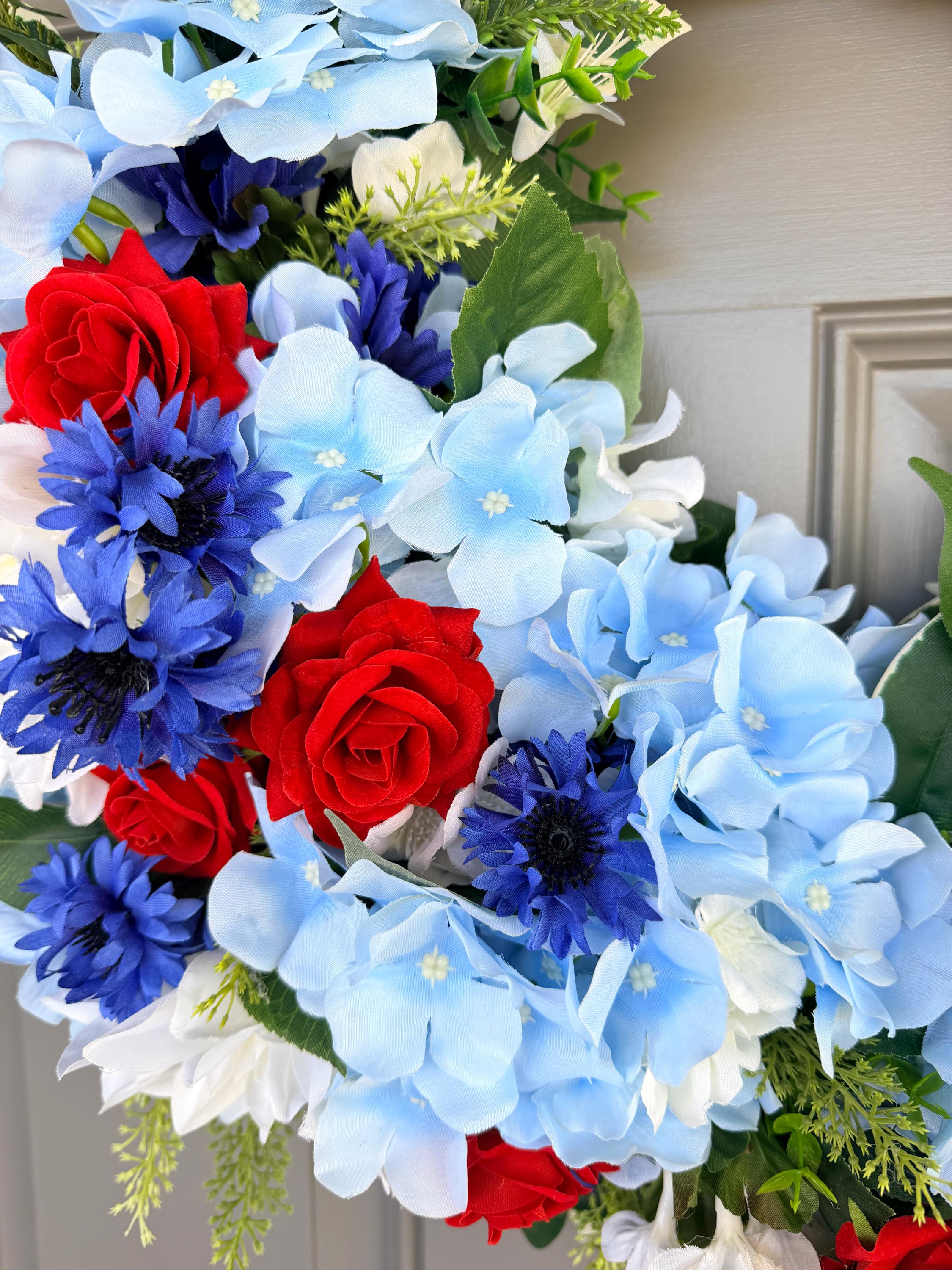 The patriotic red white and blue hydrangeas and roses wreath makes it ideal for summer styling, Memorial Day, Fourth of July, or year-round Americana décor, while its refined floral composition offers a soft, welcoming touch beyond the season. Measuring 21 inches across leaf tip to leaf tip (without bow) and 19 inches in height, and crafted on a 14 inch grapevine wreath. Includes UV treatment. Two available - order both for double door option.