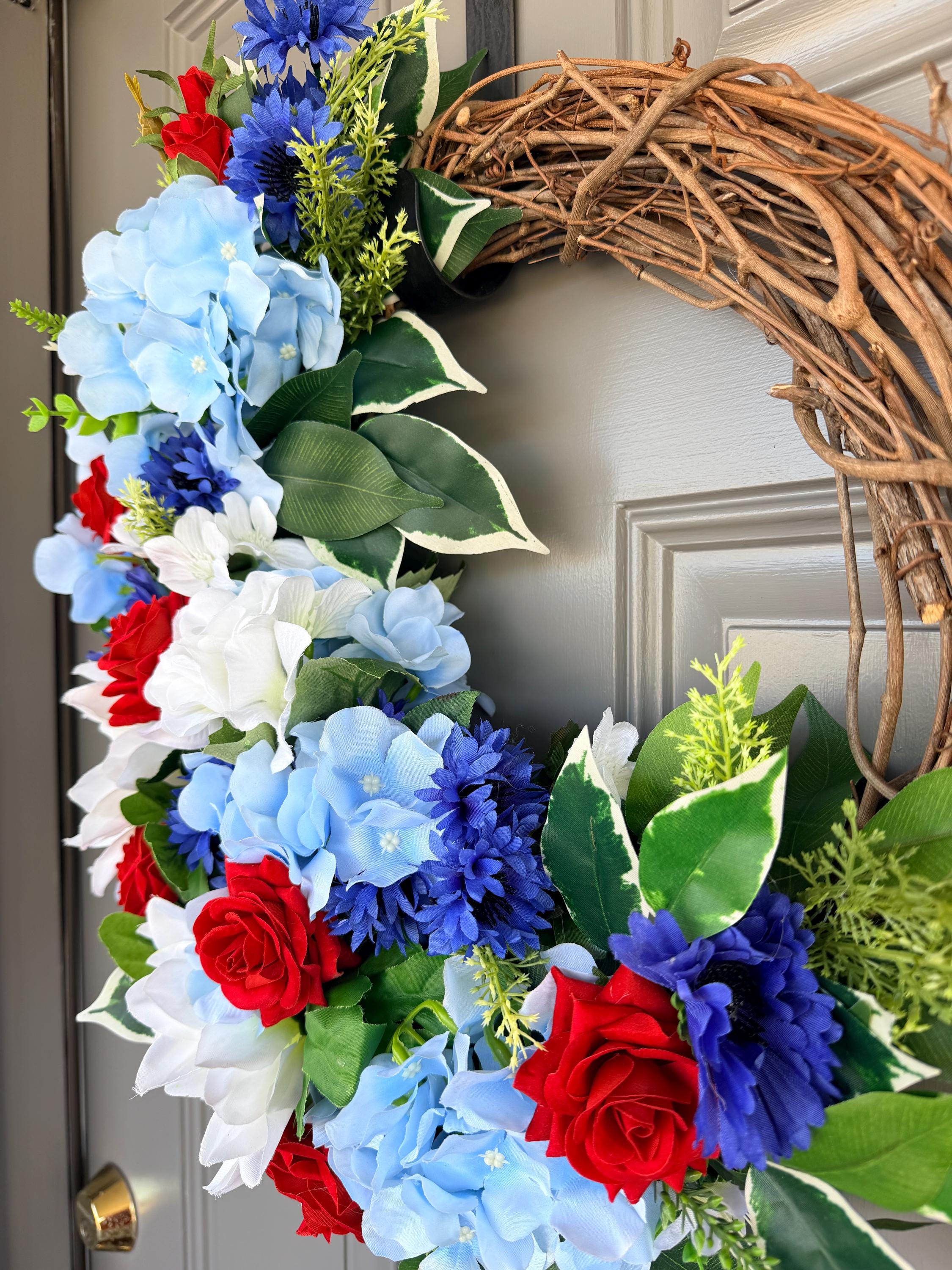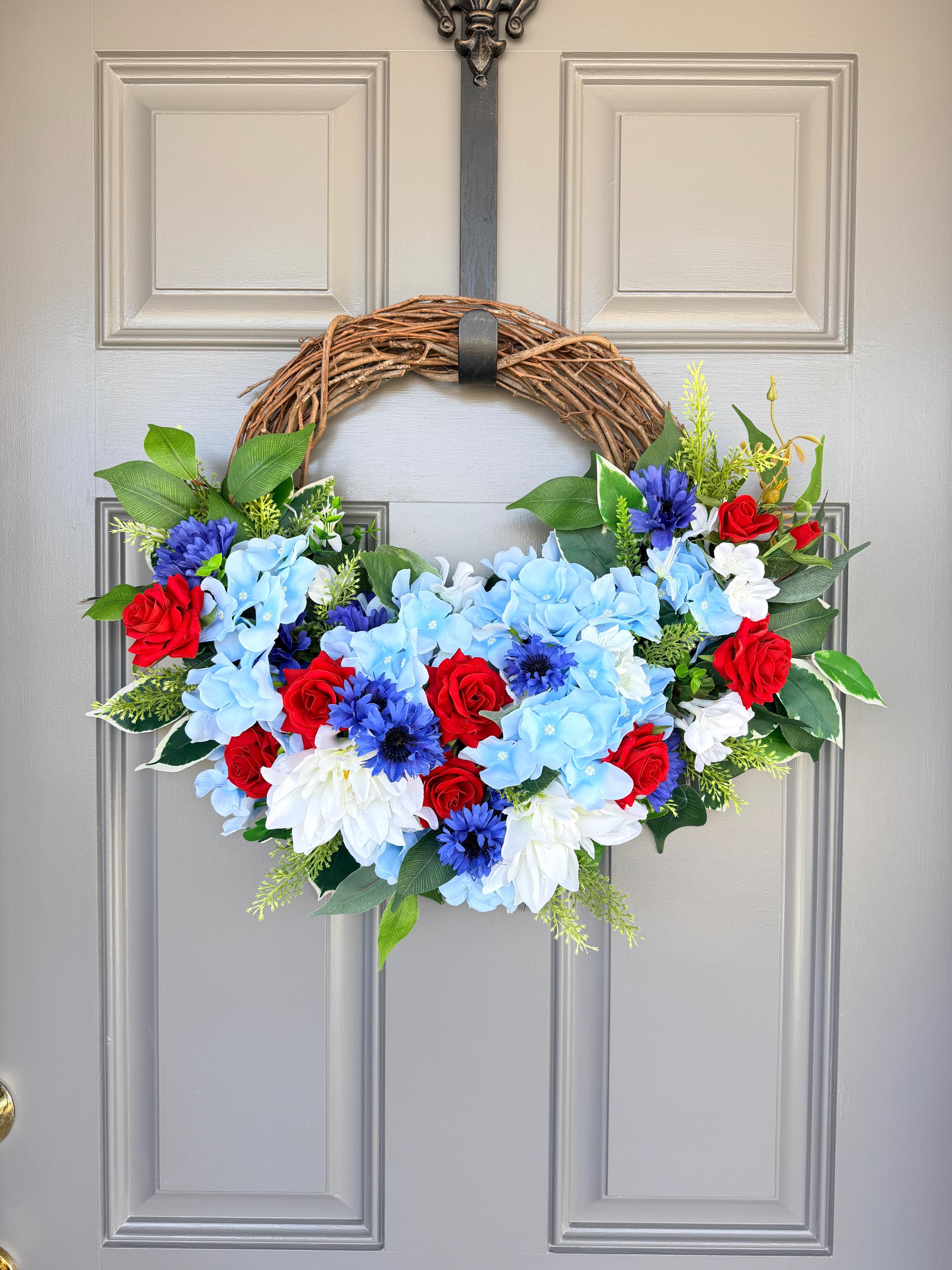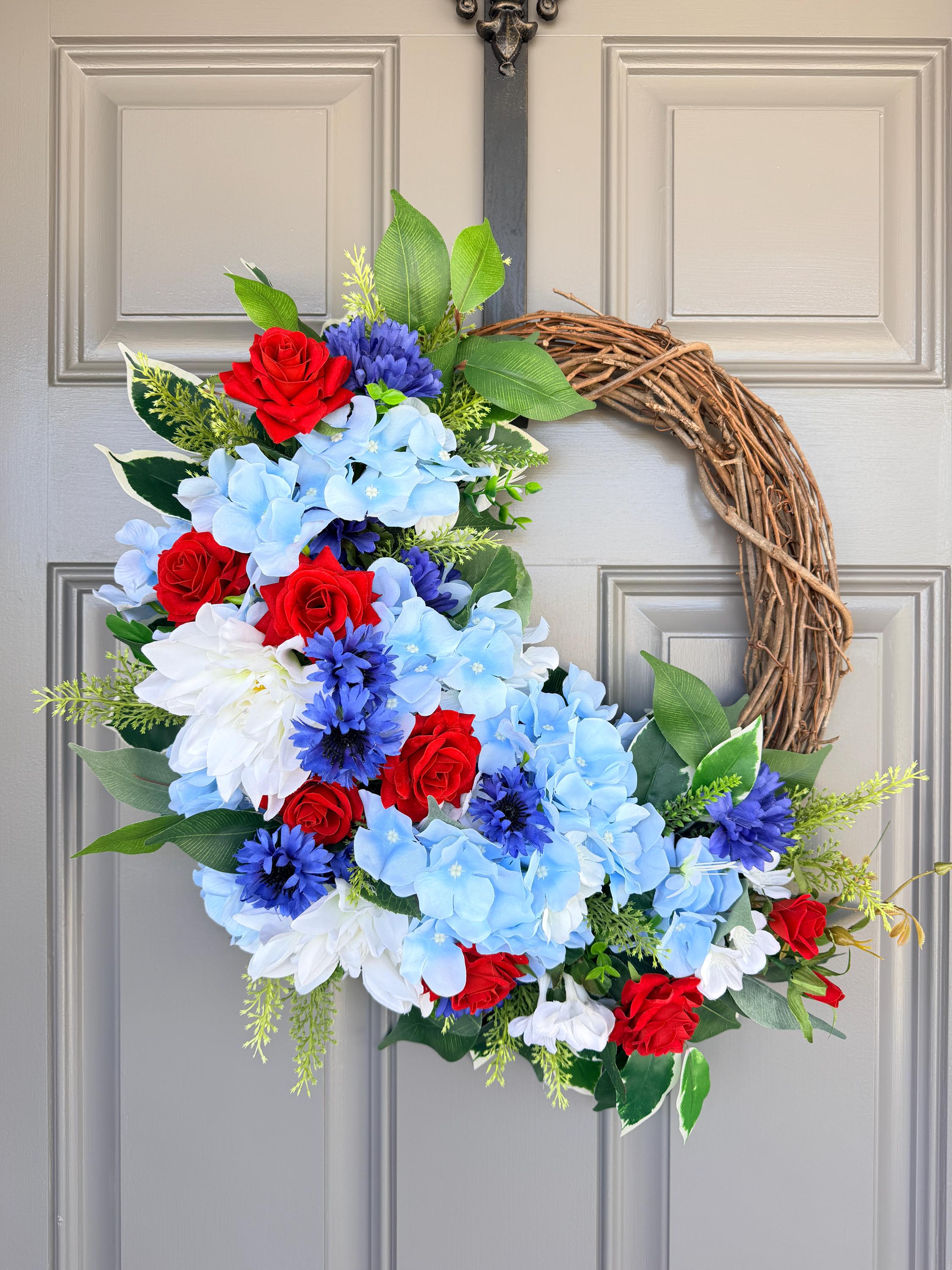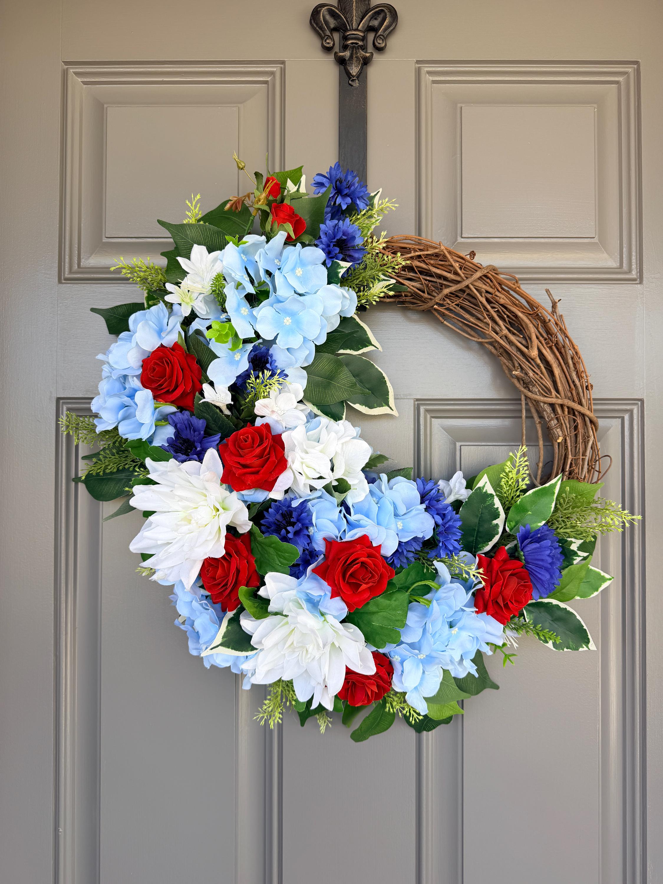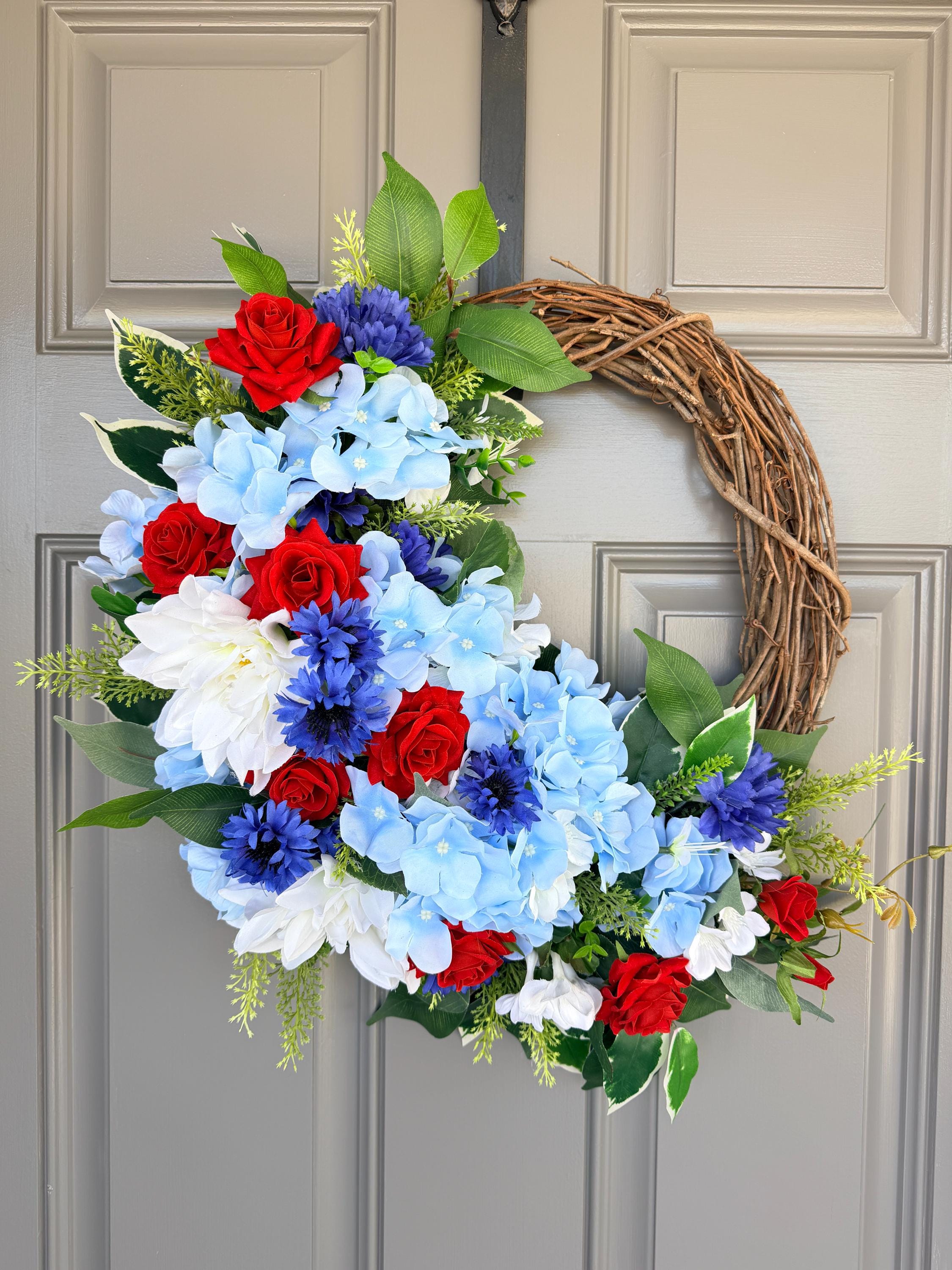 The patriotic red white and blue hydrangeas and roses wreath makes it ideal for summer styling, Memorial Day, Fourth of July, or year-round Americana décor, while its refined floral composition offers a soft, welcoming touch beyond the season. Measuring 21 inches across leaf tip to leaf tip (without bow) and 19 inches in height, and crafted on a 14 inch grapevine wreath. Includes UV treatment. Two available - order both for double door option.