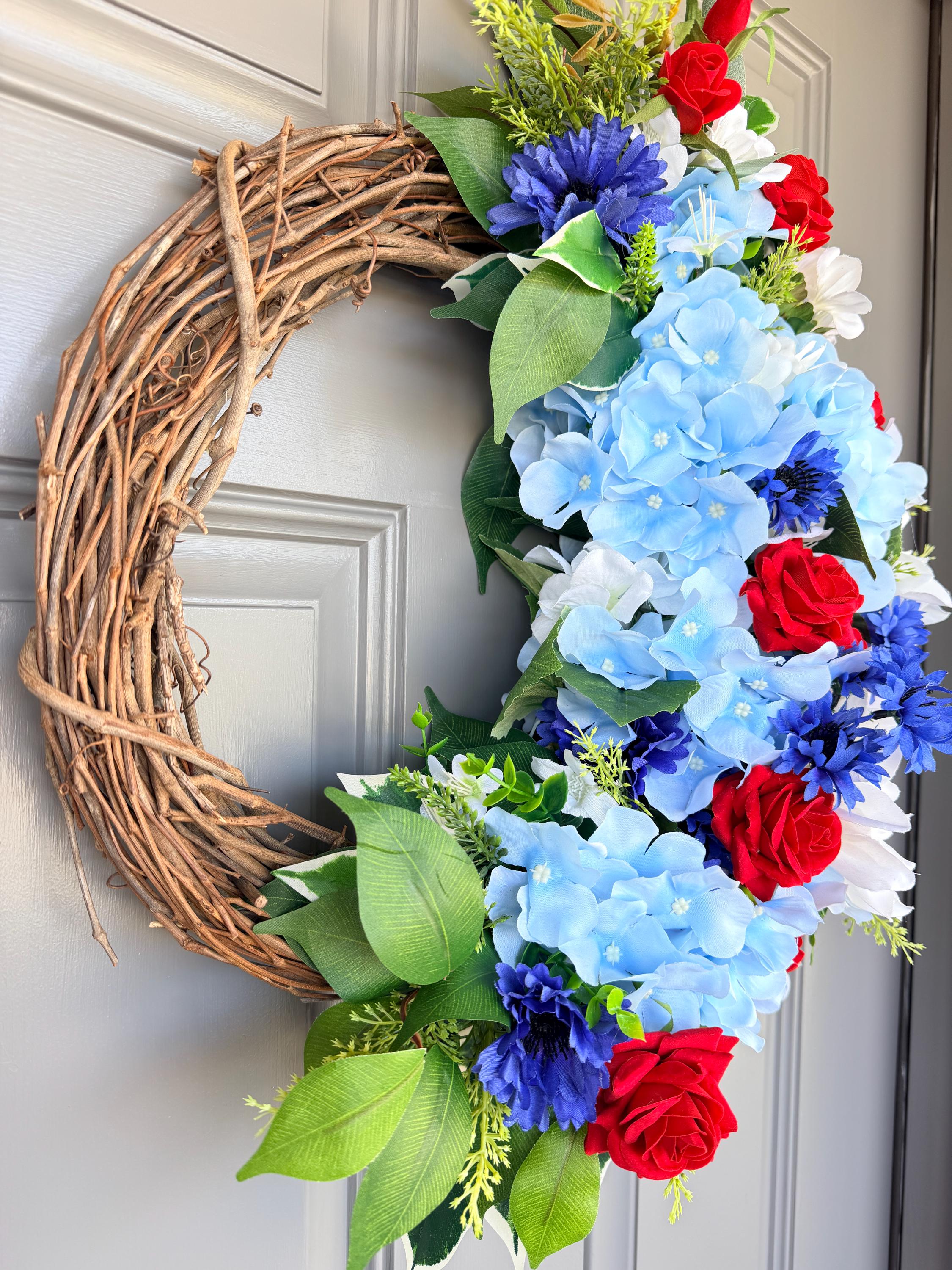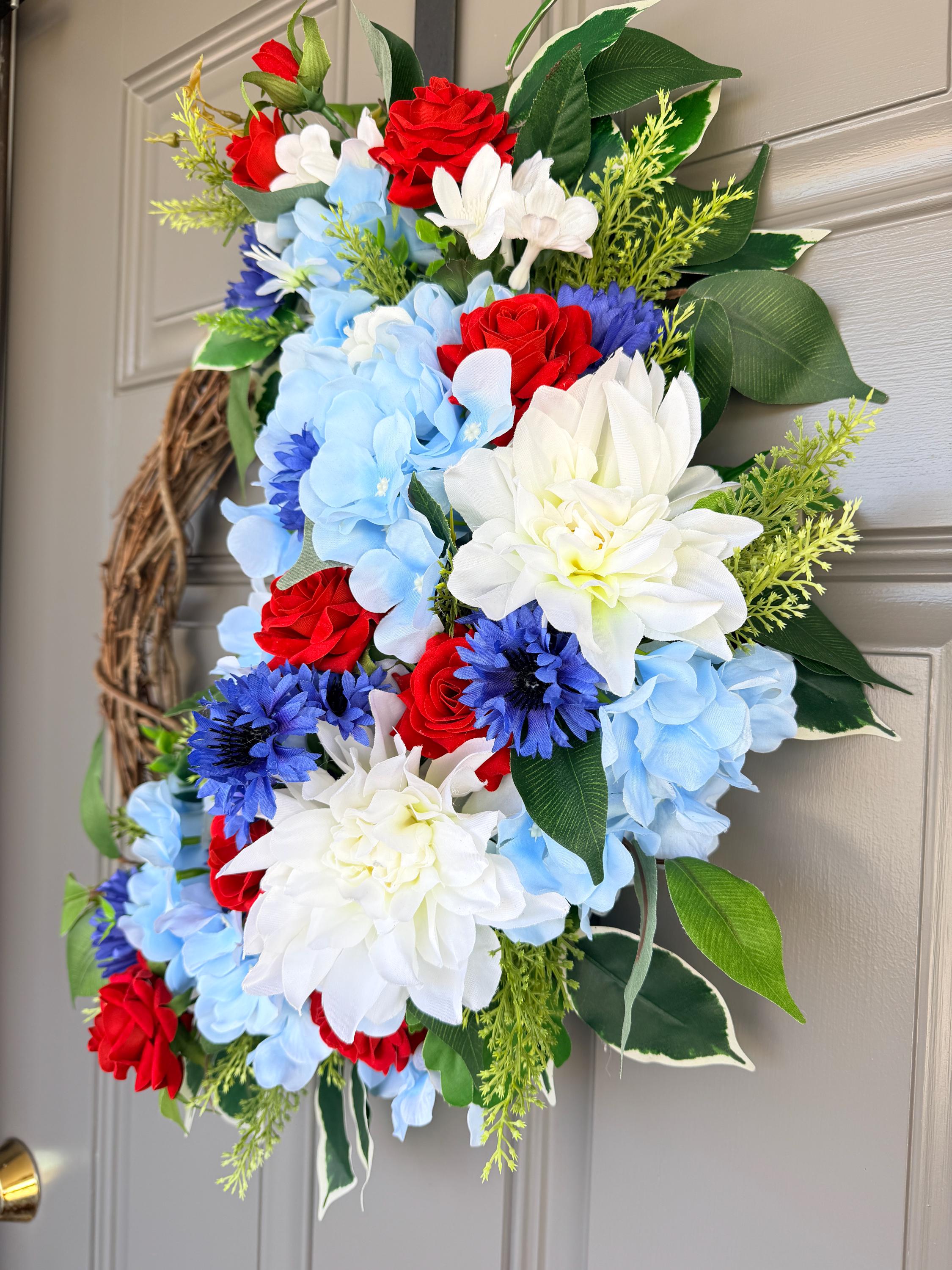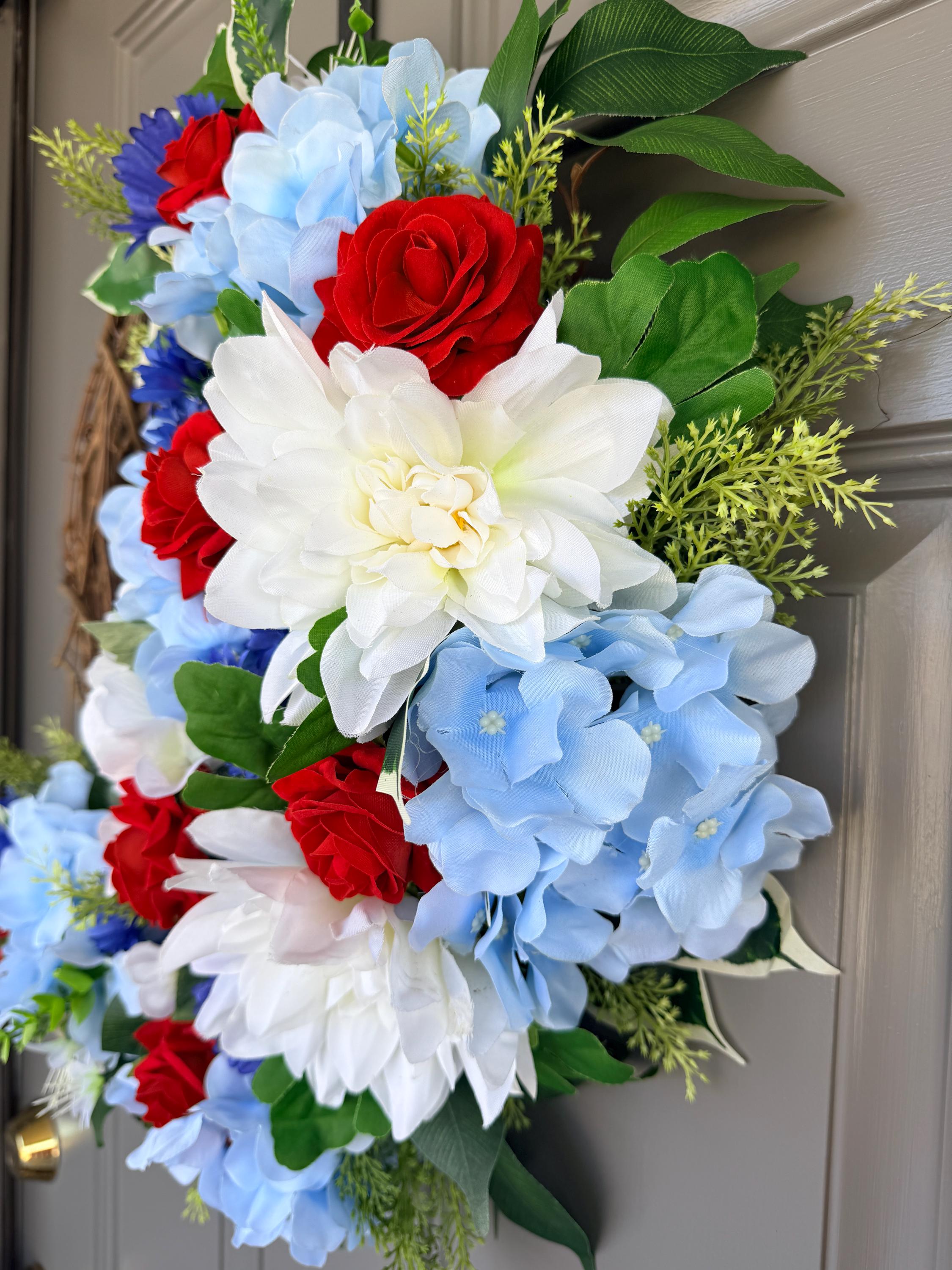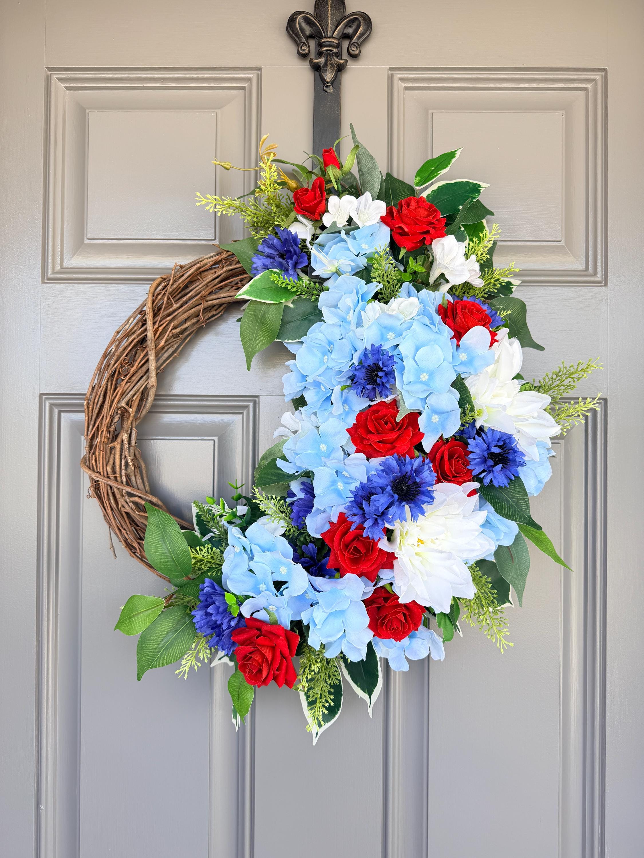 The patriotic red white and blue hydrangeas and roses wreath makes it ideal for summer styling, Memorial Day, Fourth of July, or year-round Americana décor, while its refined floral composition offers a soft, welcoming touch beyond the season. Measuring 21 inches across leaf tip to leaf tip (without bow) and 19 inches in height, and crafted on a 14 inch grapevine wreath. Includes UV treatment. Two available - order both for double door option.