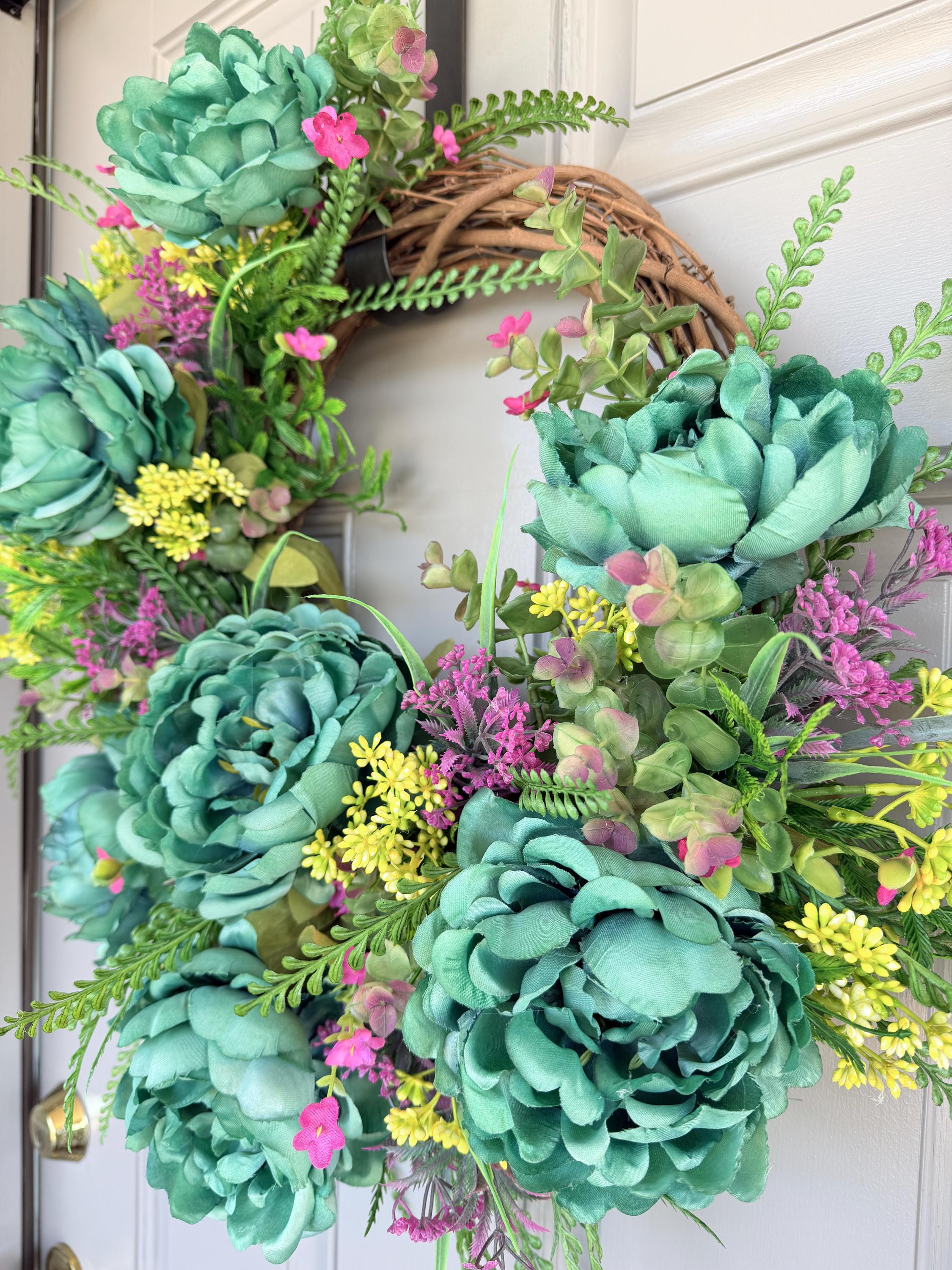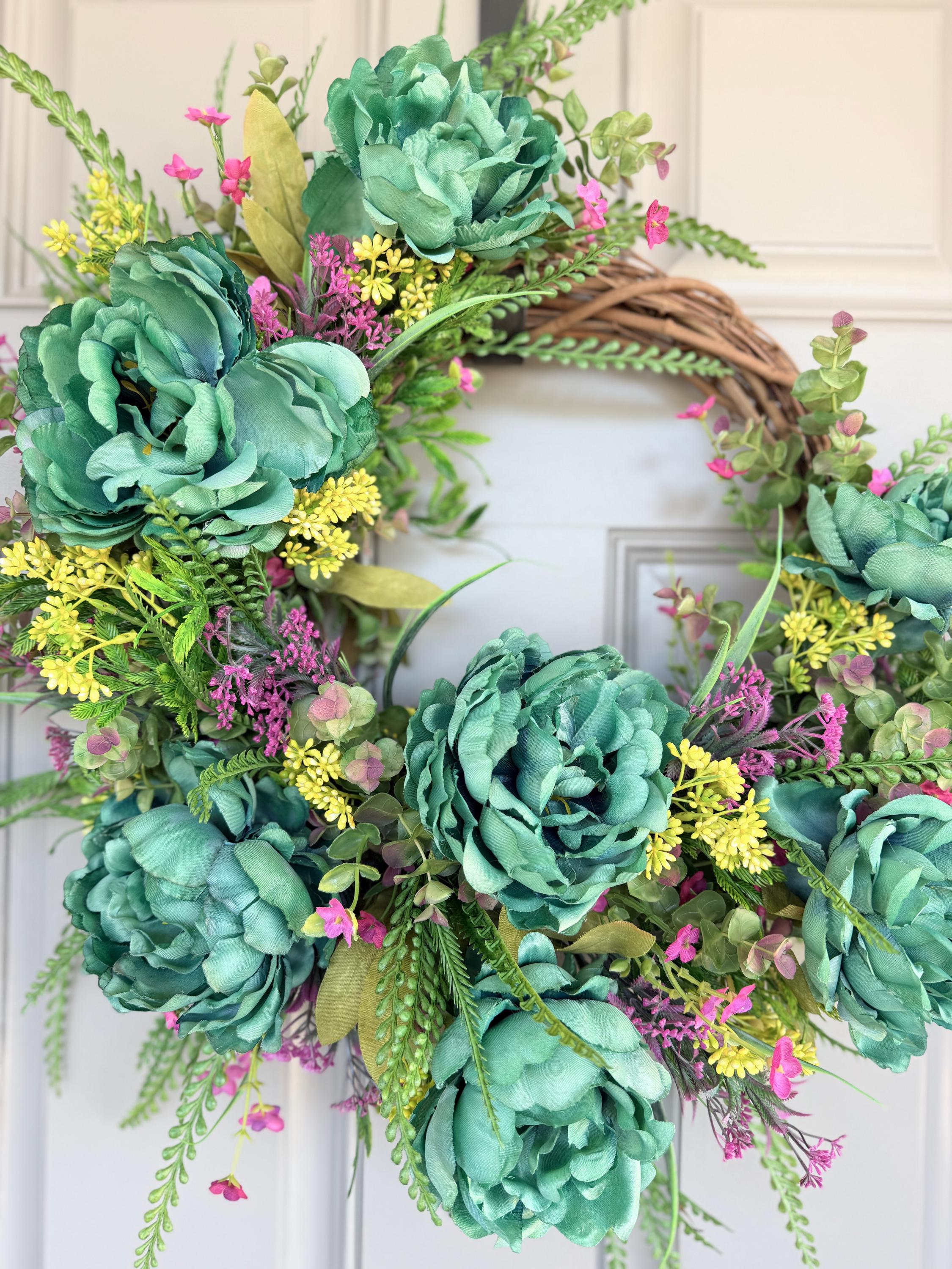 Lush teal peonies, button leaf greenery, and pink floral accents on a natural grapevine base. Perfect for spring, summer, or year-round display, this wreath adds a touch of elegance to any front door, entryway, or interior space. This wreath makes a wonderful gift for Mother's Day, birthdays, or new homeowners. Please see all photos of variations.