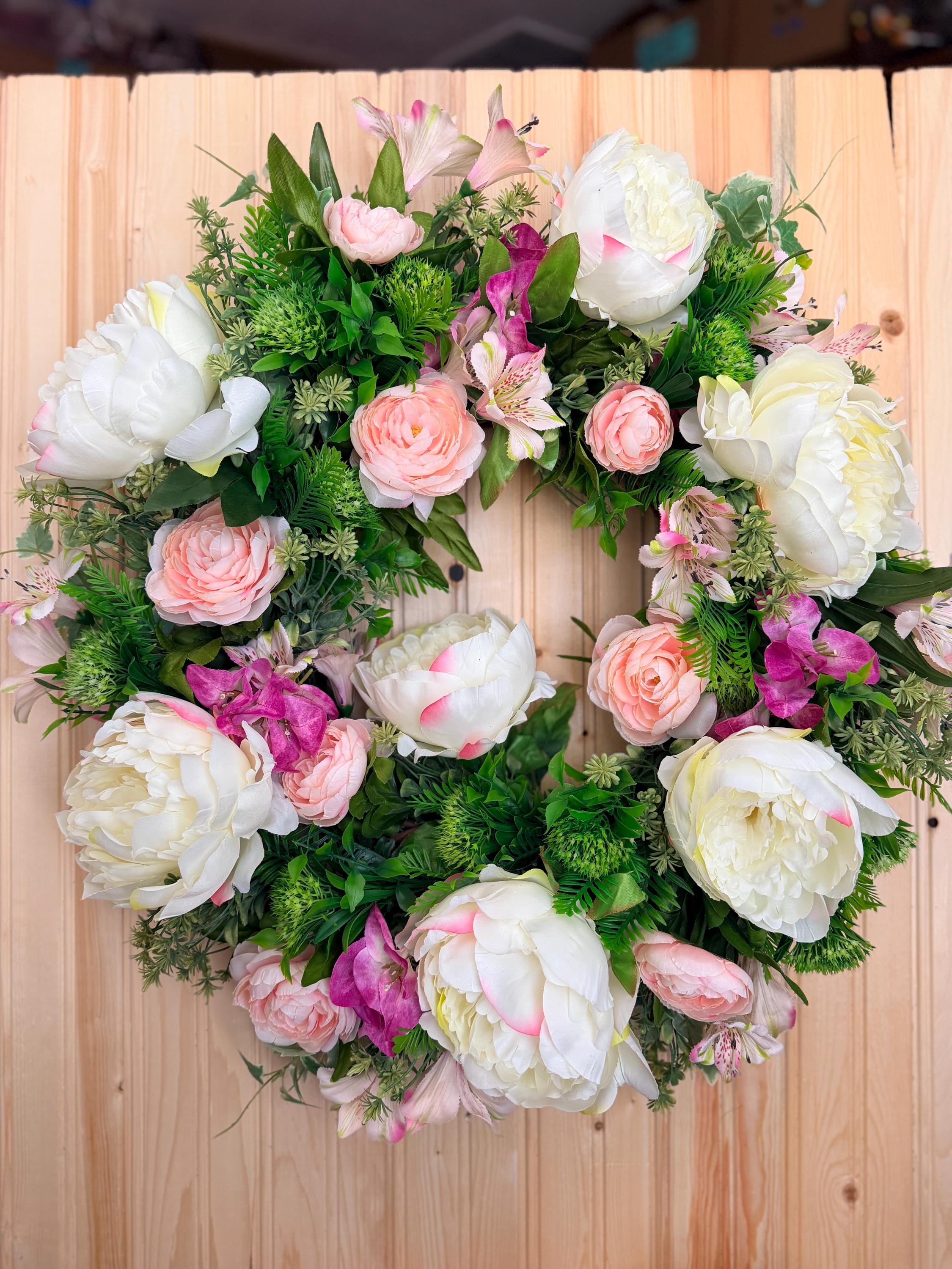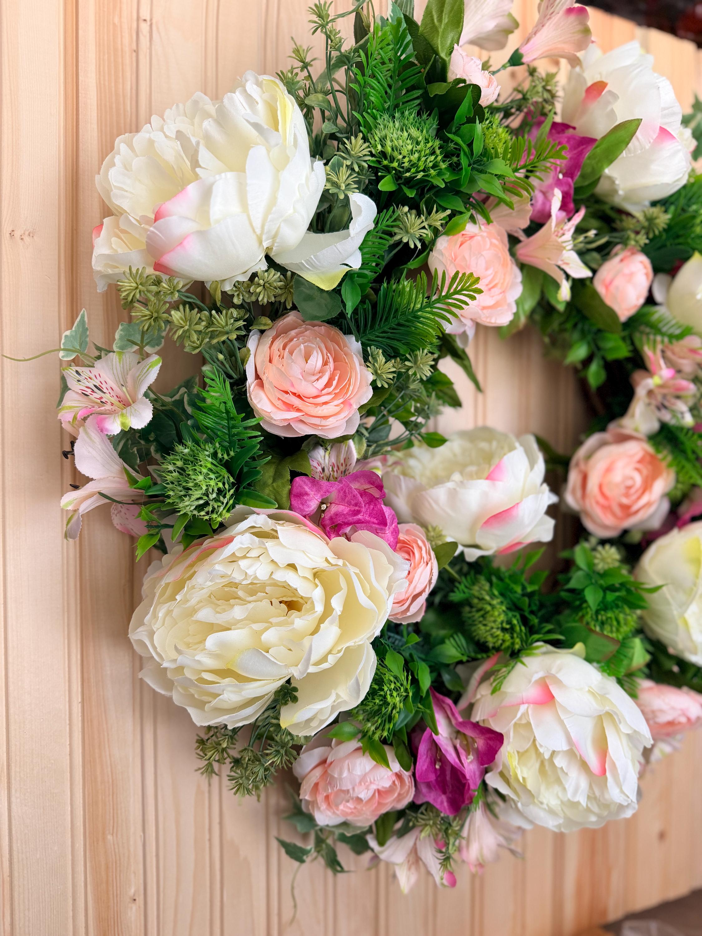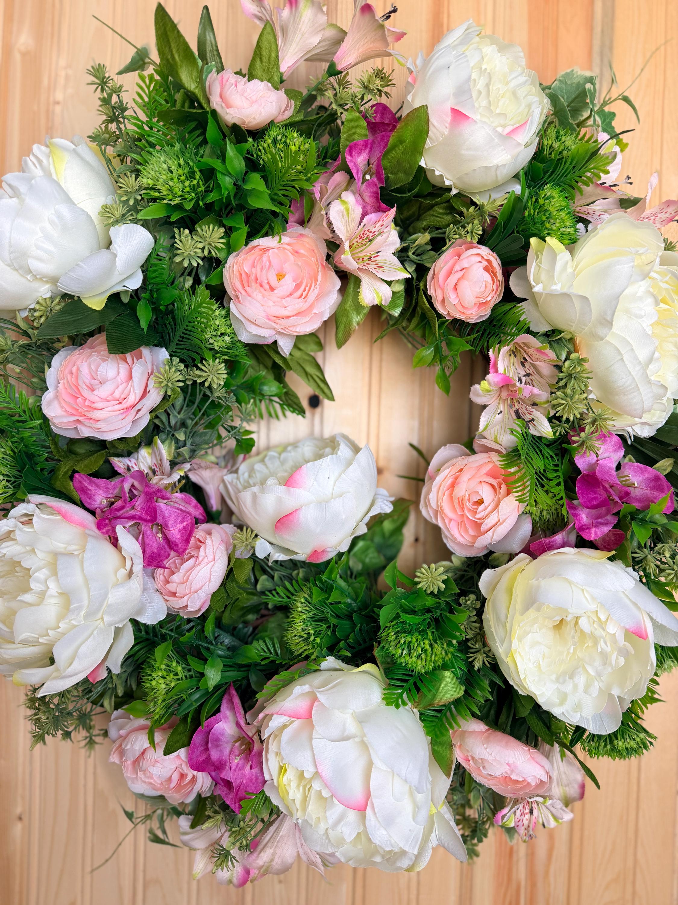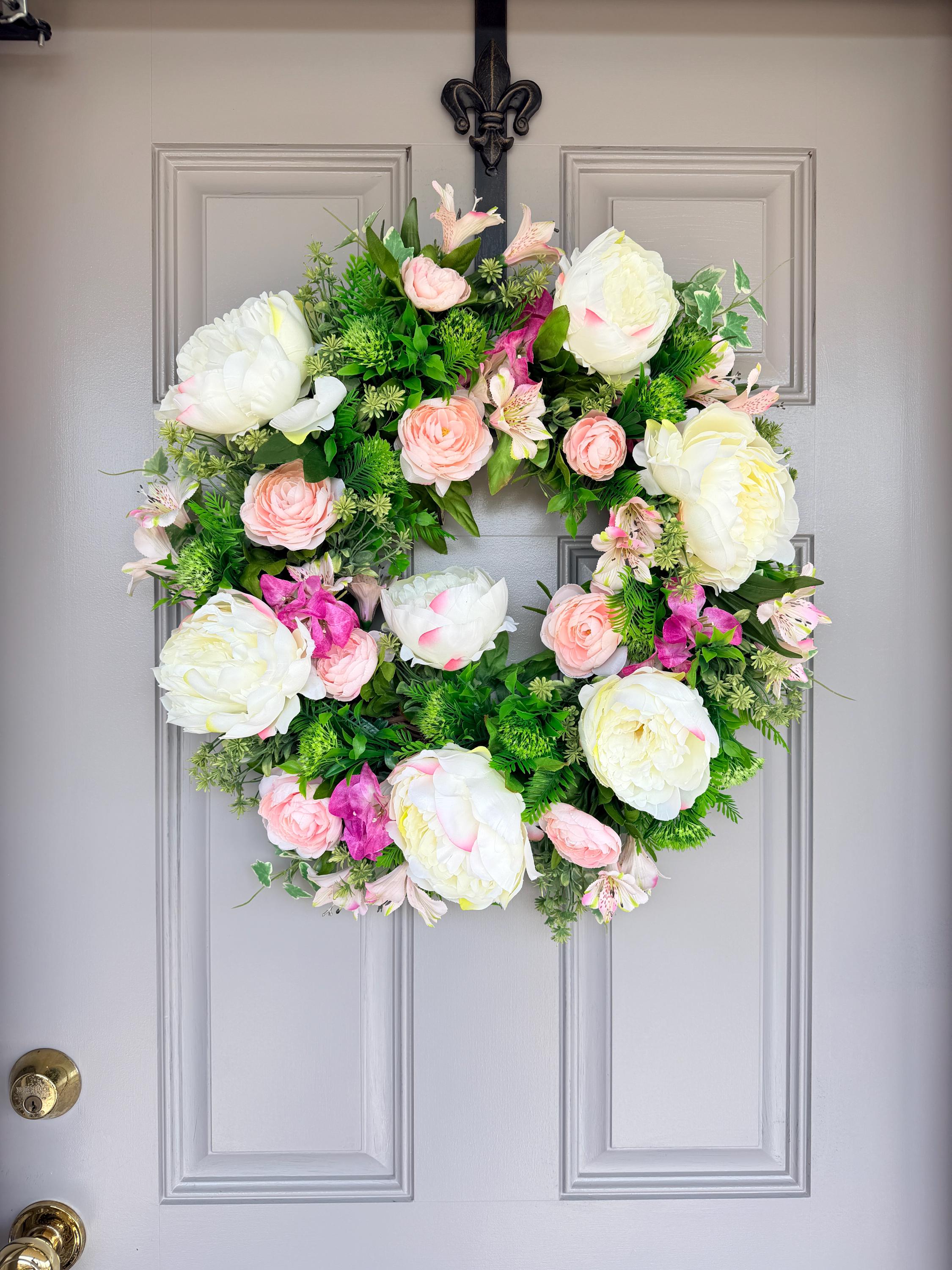 This handcrafted wreath features lush white peonies, blush pink roses, and vibrant greenery for a fresh garden-inspired look. Perfect for spring and summer, it adds timeless charm to your front door or entryway and makes a thoughtful housewarming gift. Pictured on a standard-sized front door.