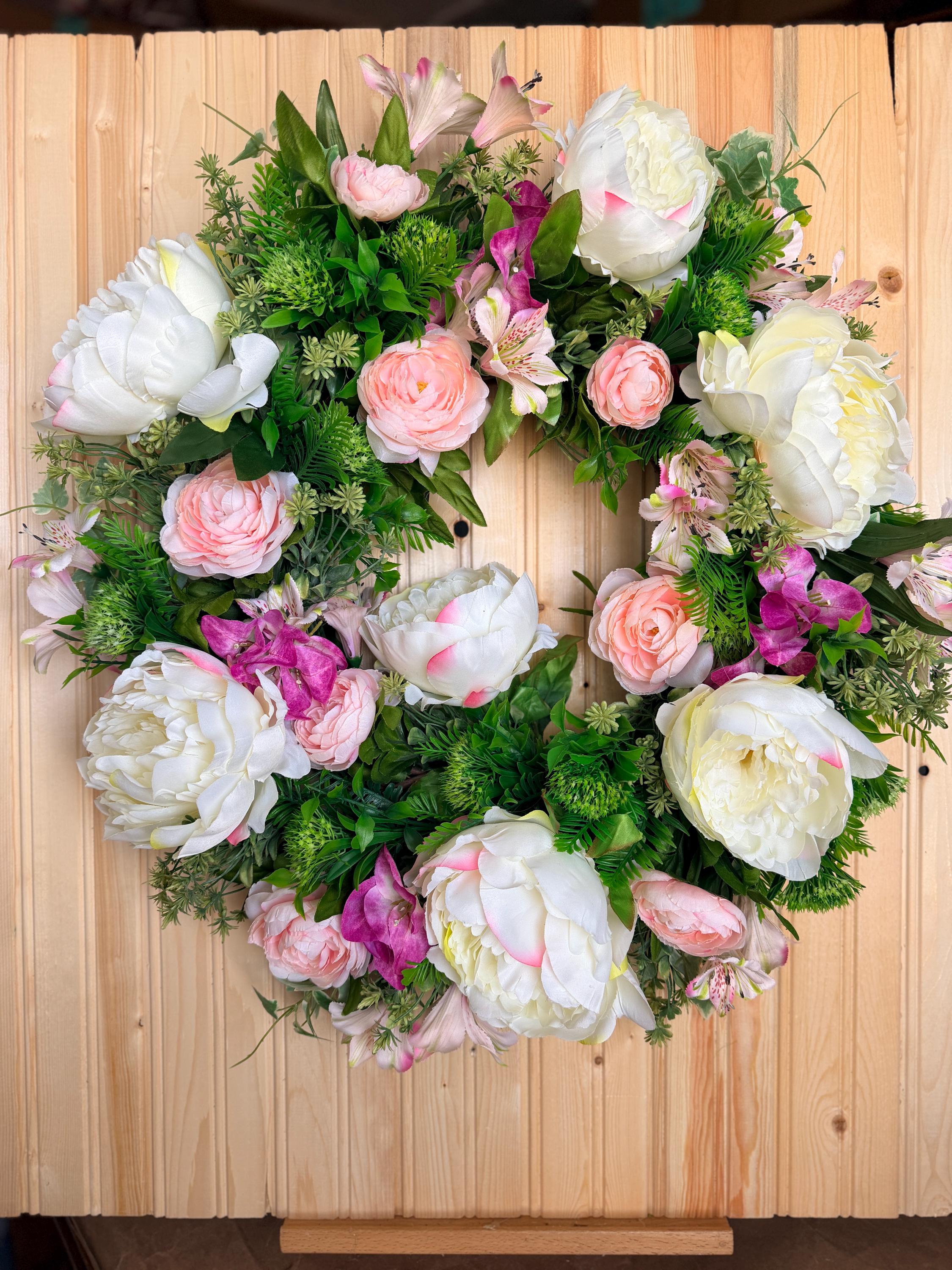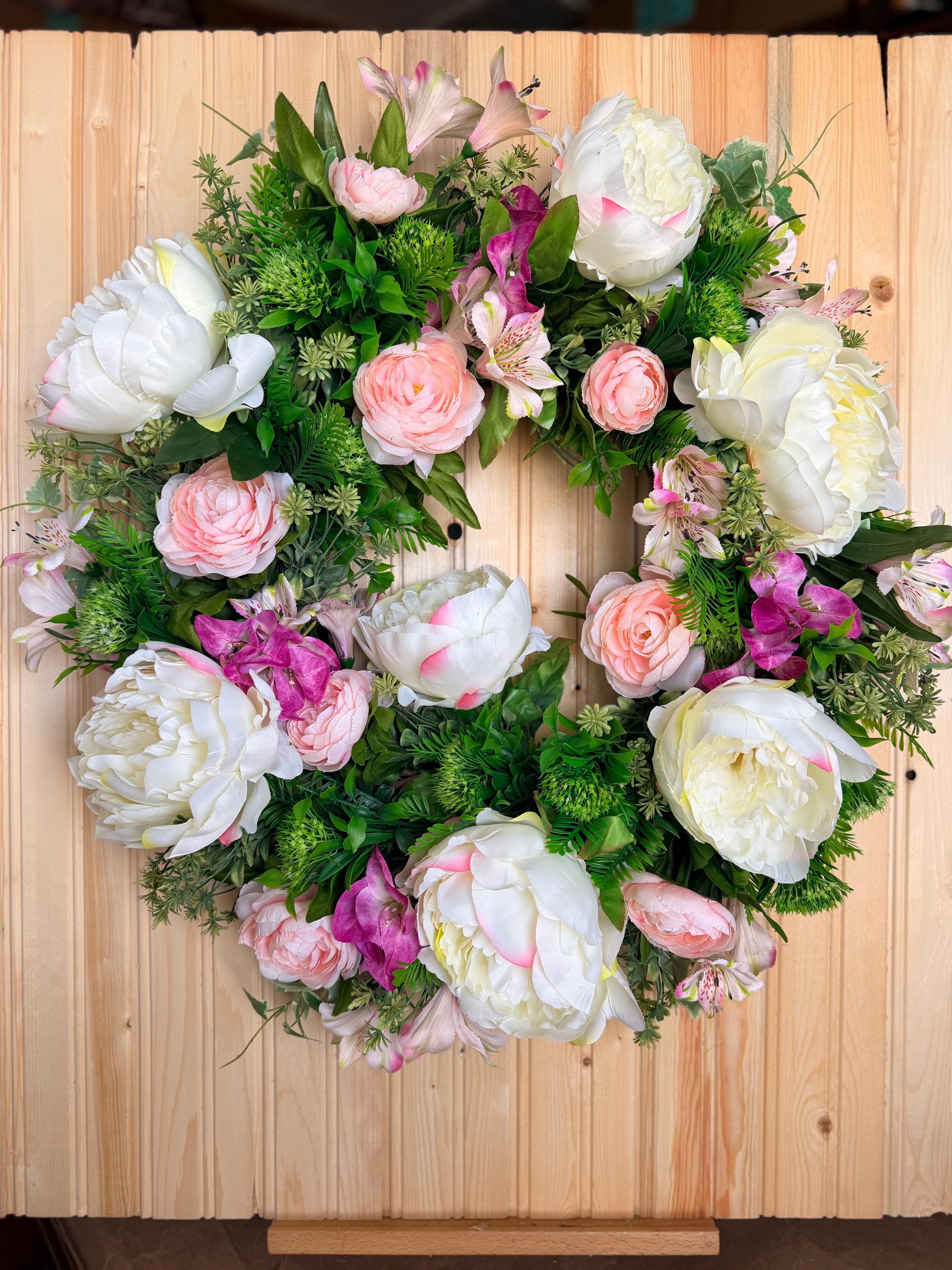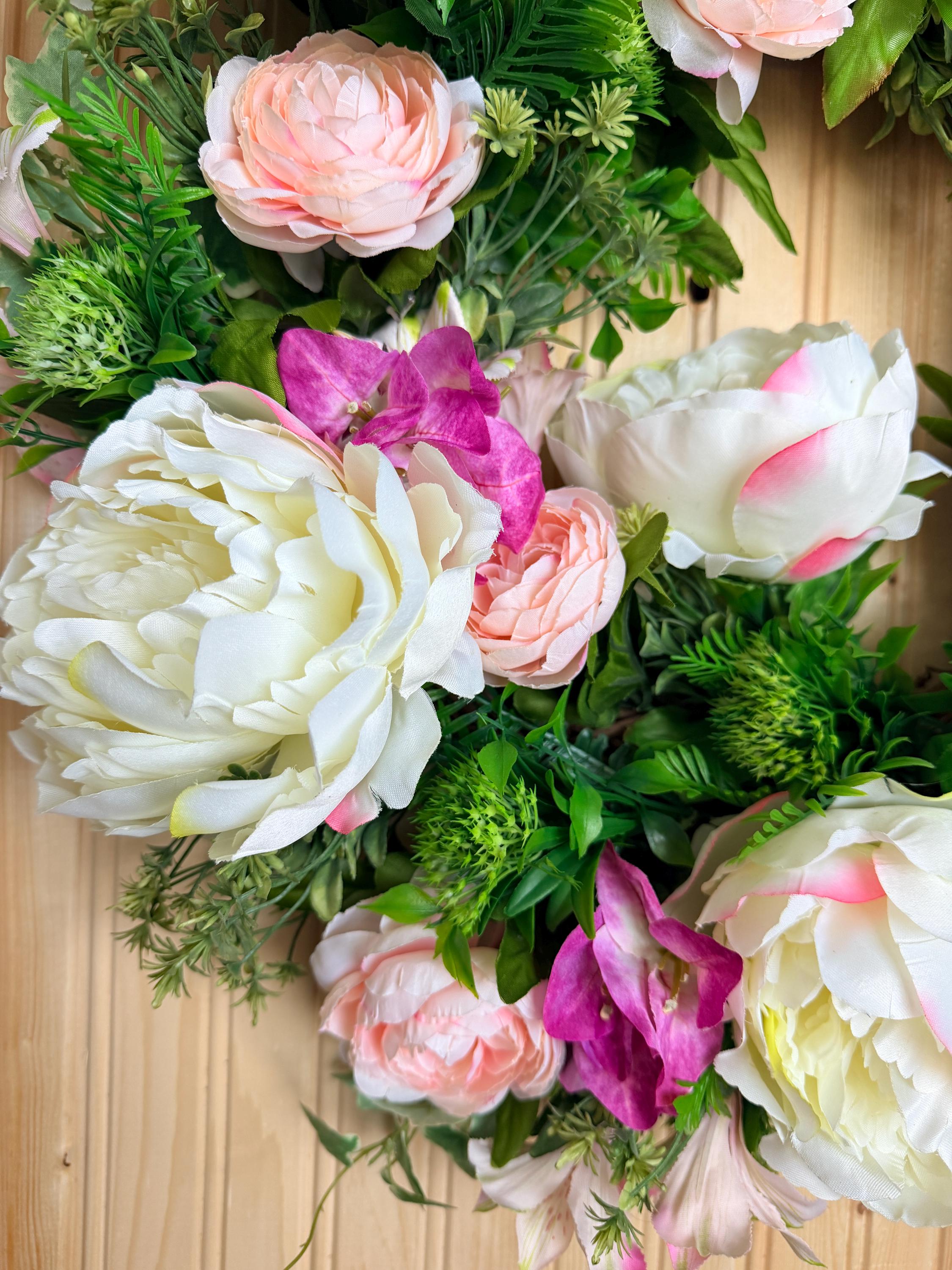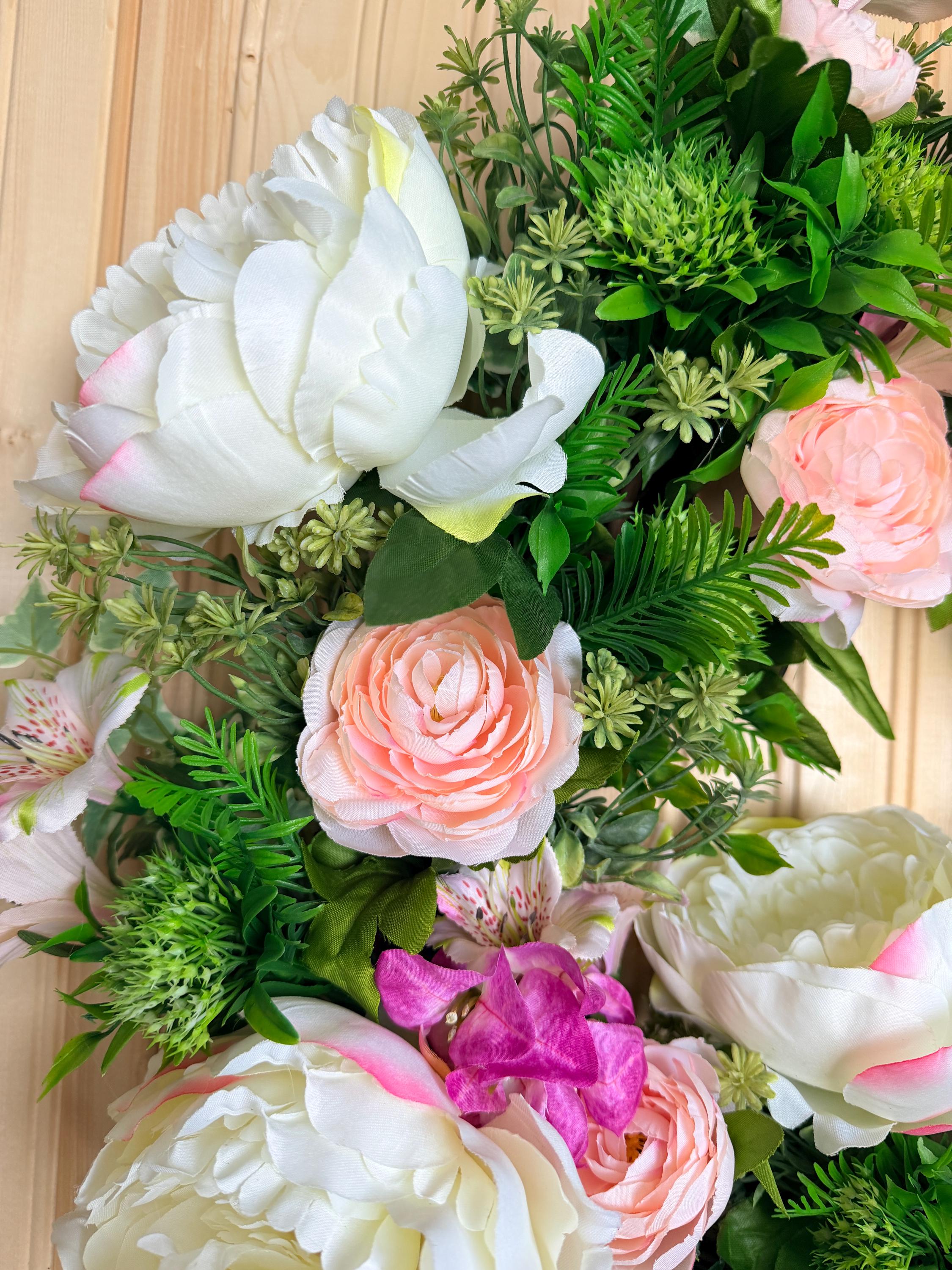 This handcrafted wreath features lush white peonies, blush pink roses, and vibrant greenery for a fresh garden-inspired look. Perfect for spring and summer, it adds timeless charm to your front door or entryway and makes a thoughtful housewarming gift. Pictured on a standard-sized front door.