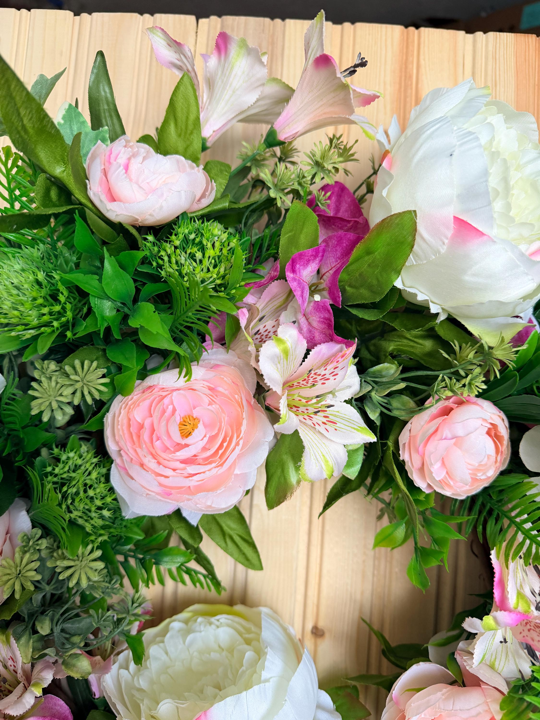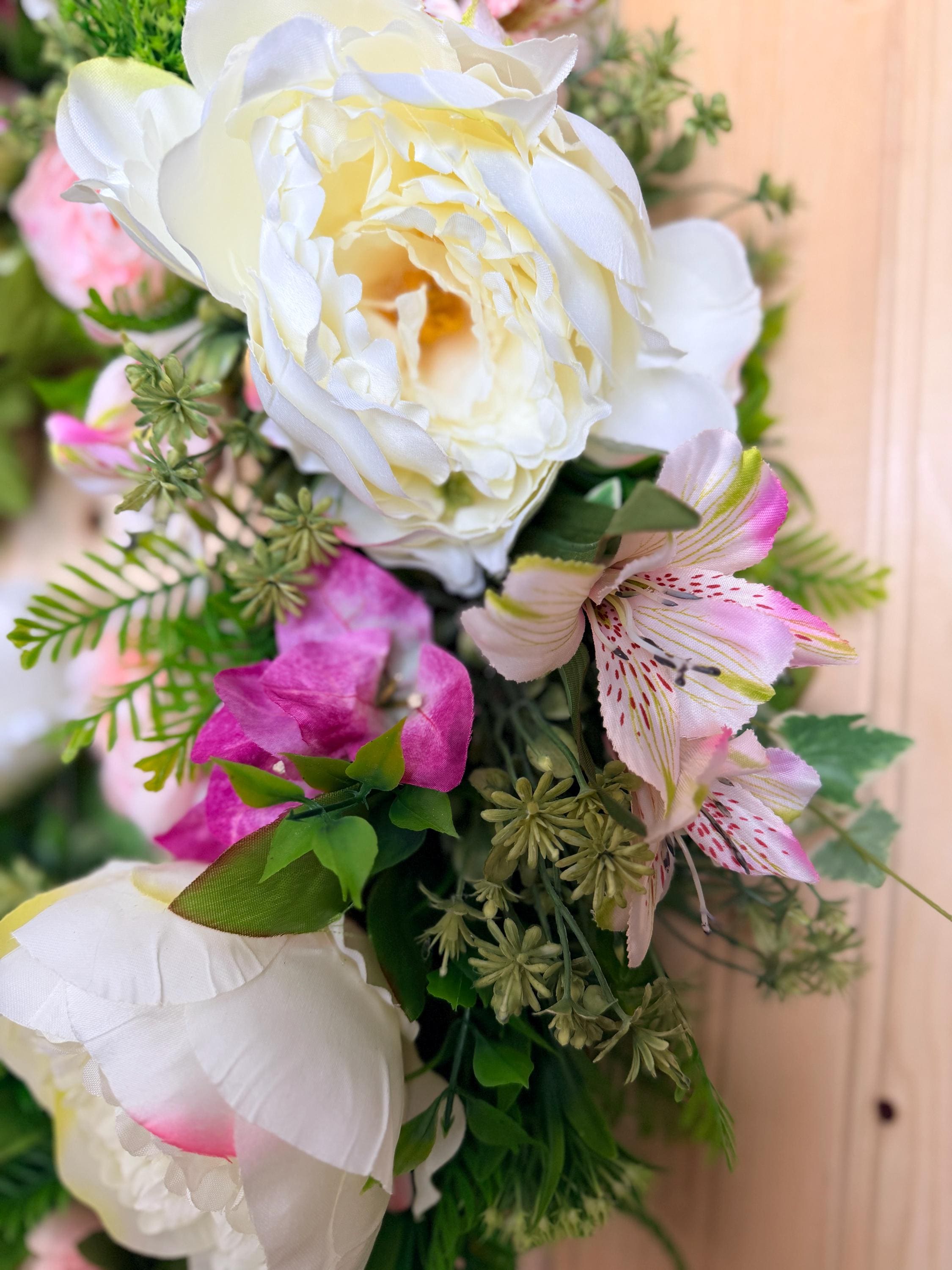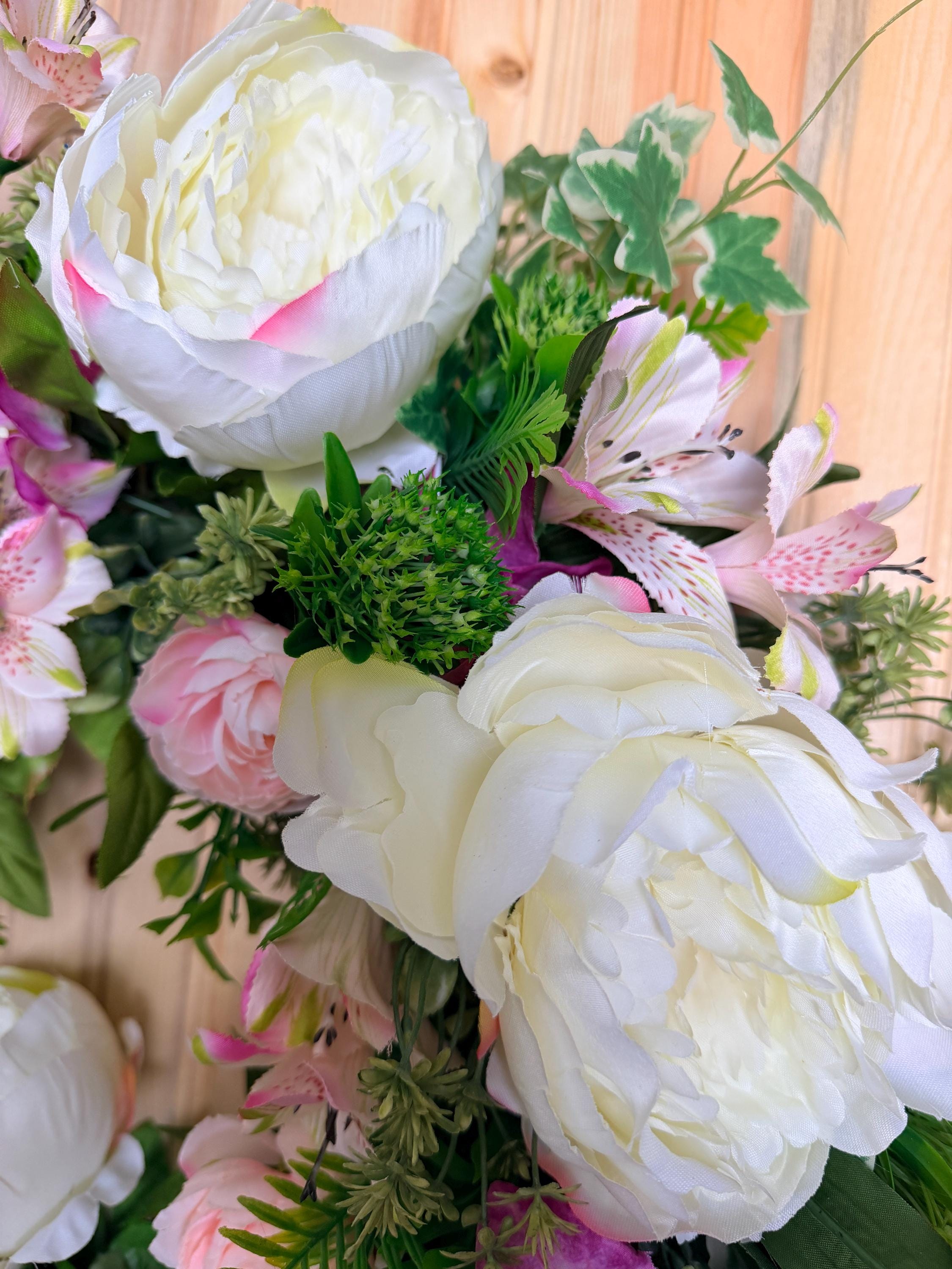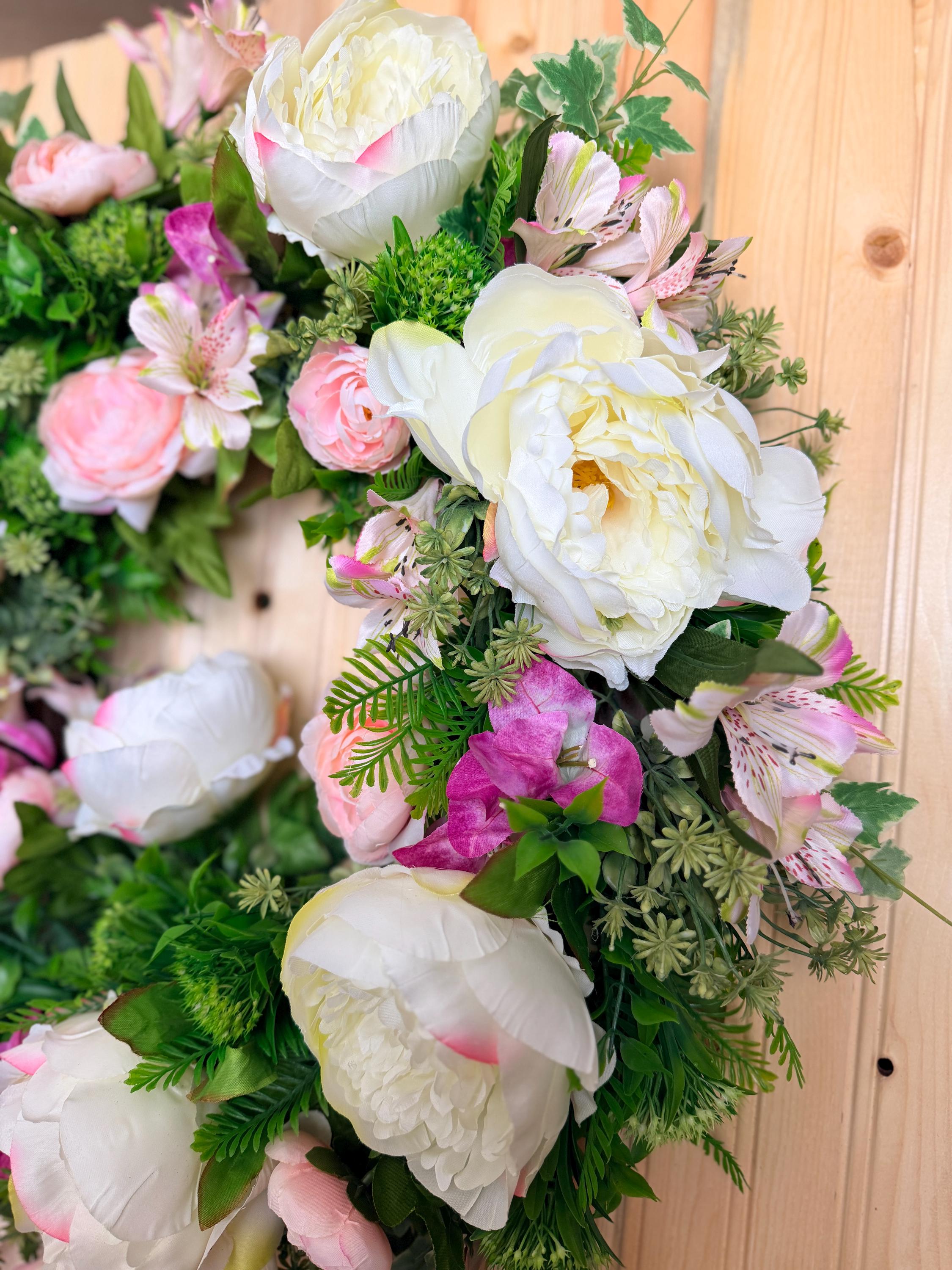 This handcrafted wreath features lush white peonies, blush pink roses, and vibrant greenery for a fresh garden-inspired look. Perfect for spring and summer, it adds timeless charm to your front door or entryway and makes a thoughtful housewarming gift. Pictured on a standard-sized front door.
