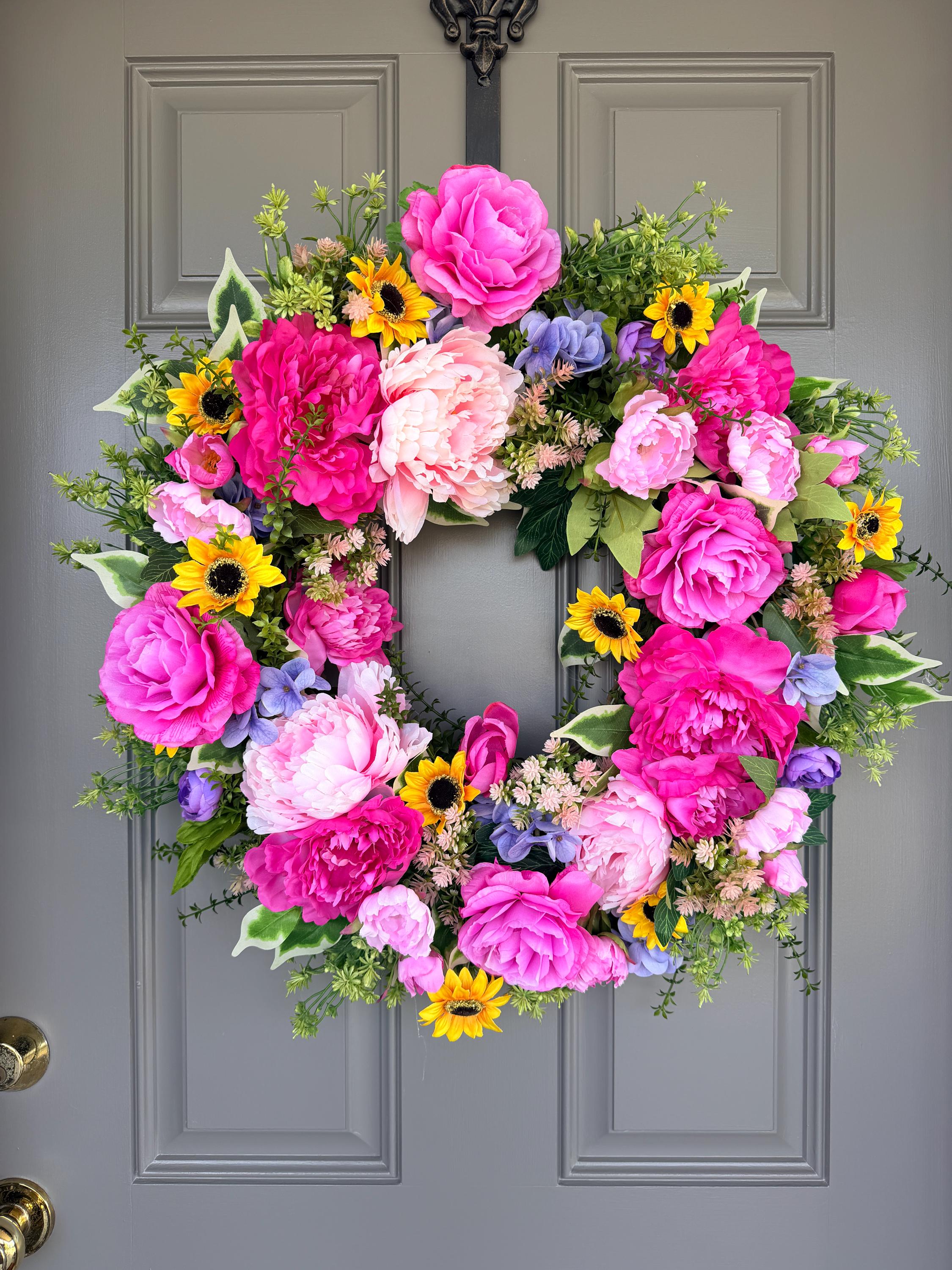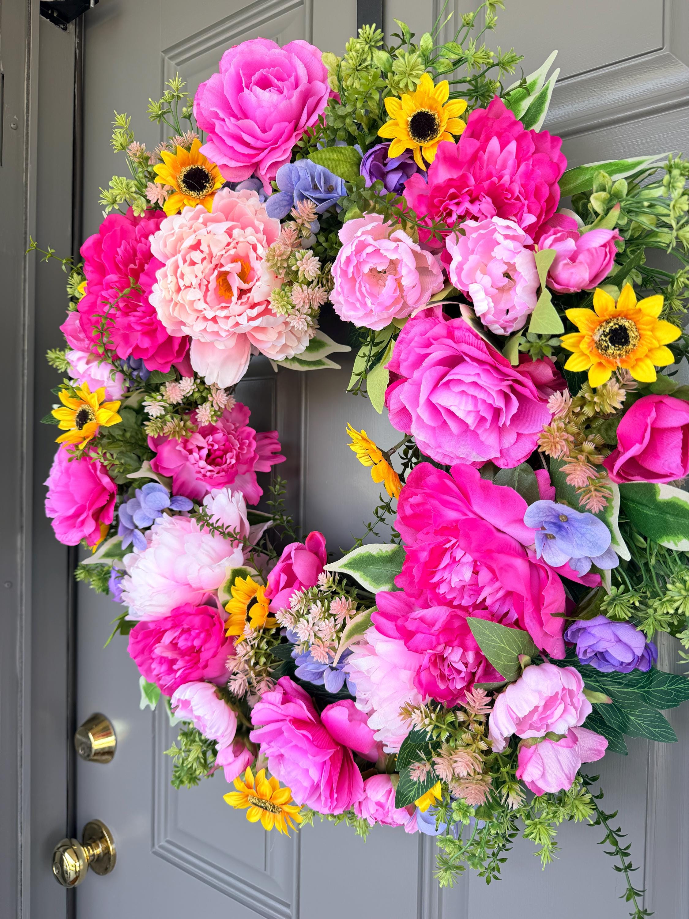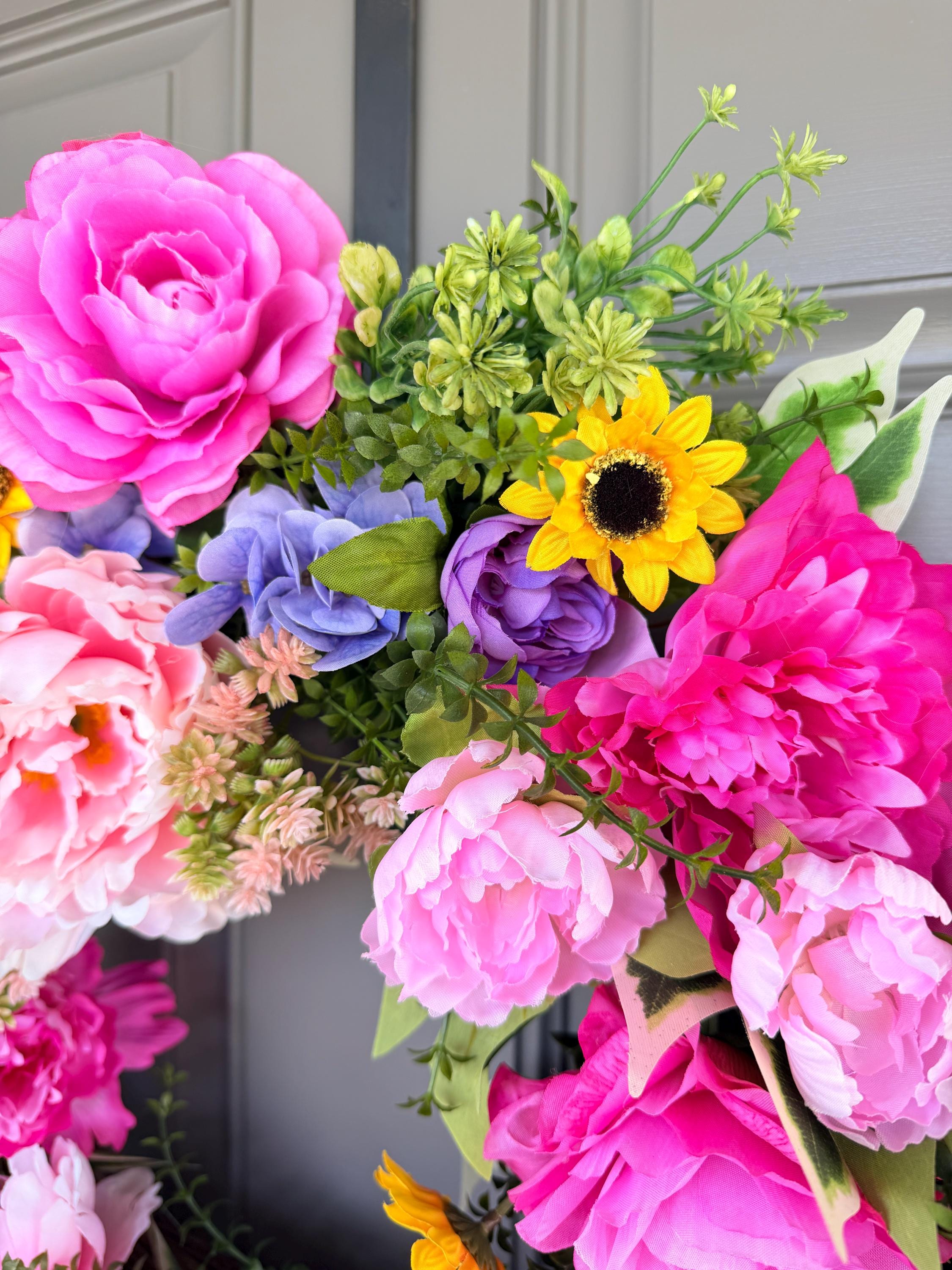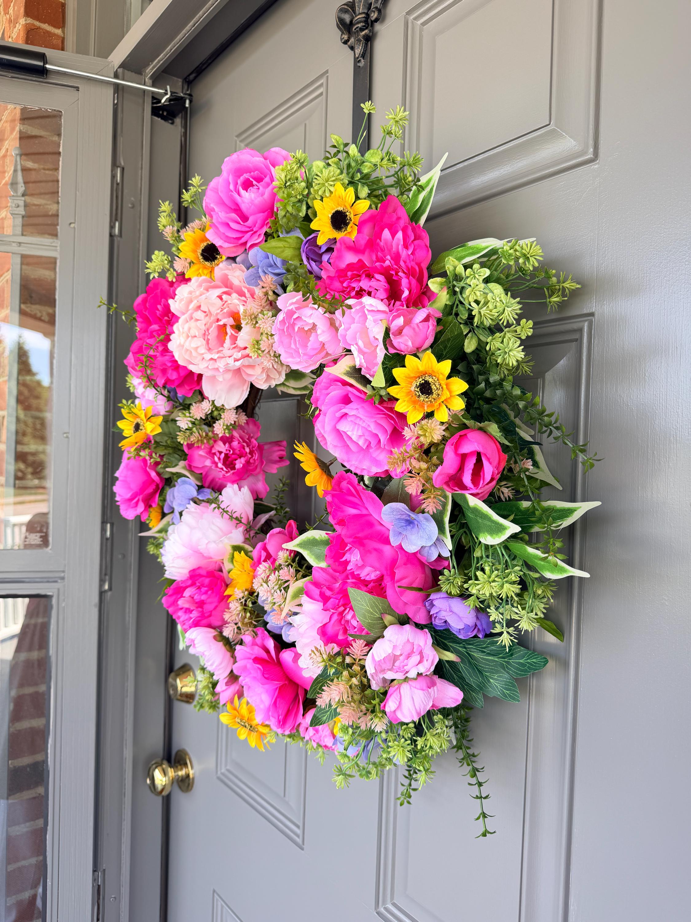 Pink peonies and ranunculus with soft greenery and succulent in a garden-inspired composition. Rich in texture and color, it brings a fresh, sophisticated charm to your front door or interior space. If you’re styling double doors, I’d be happy to create a coordinating pair—just reach out for a custom order.