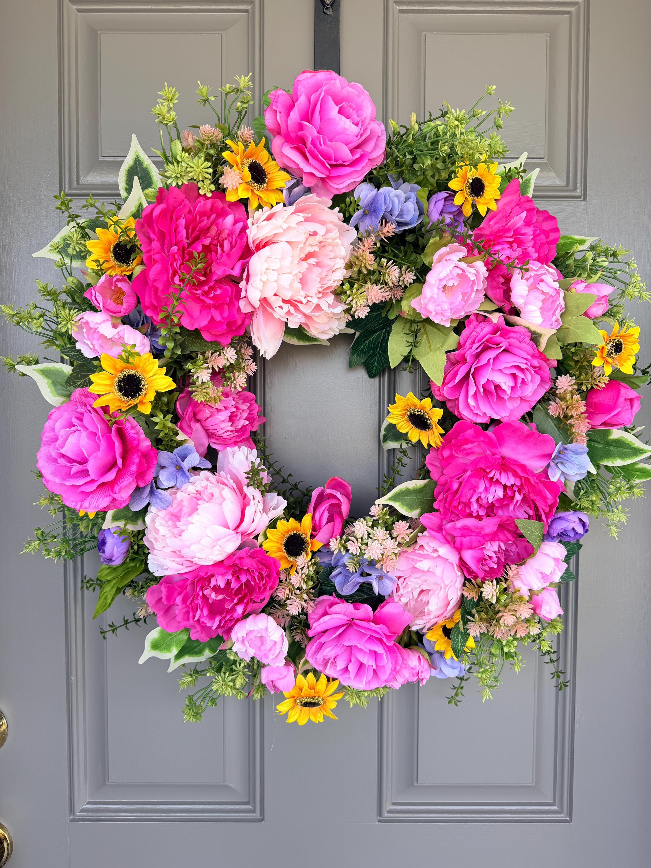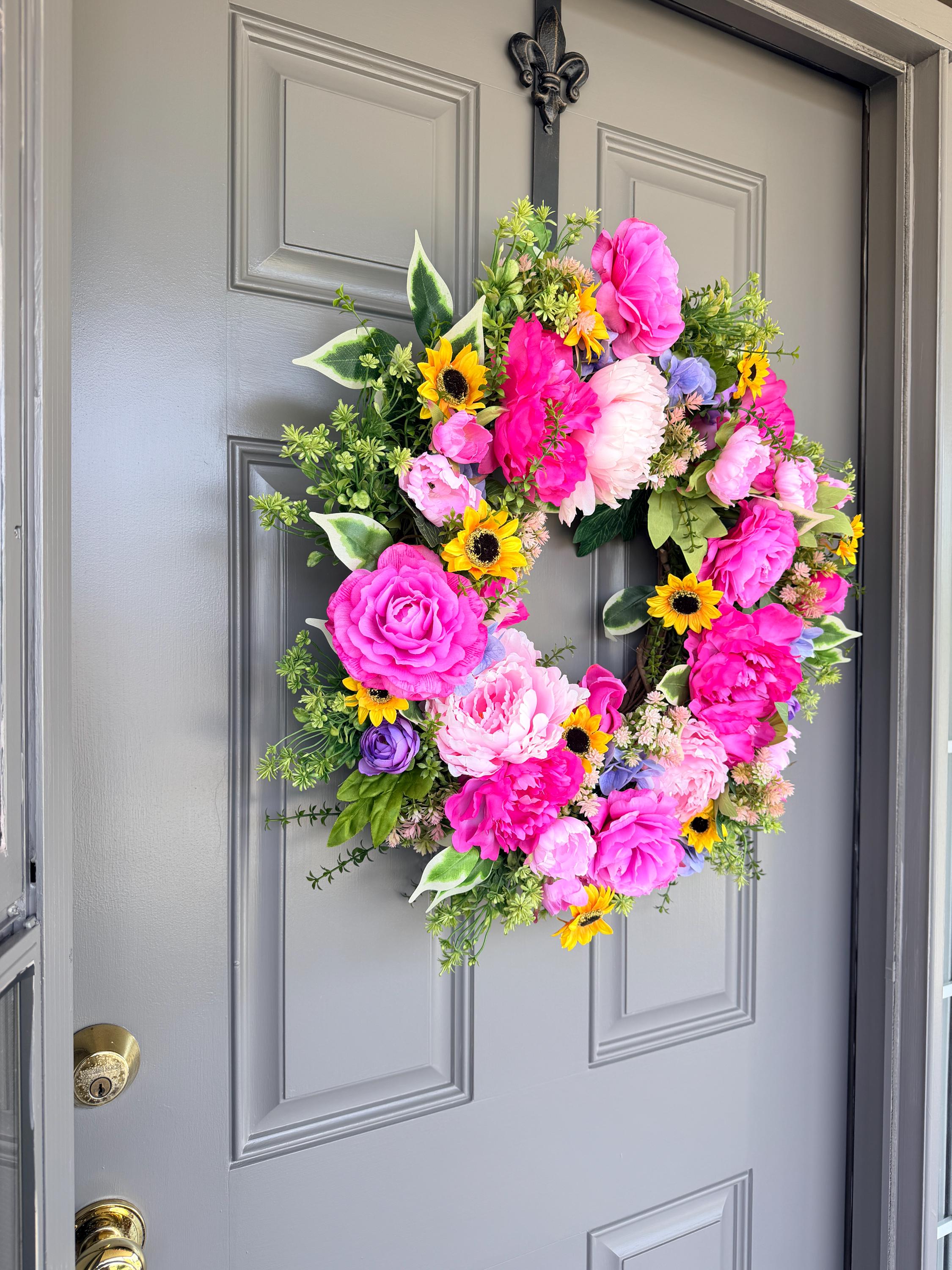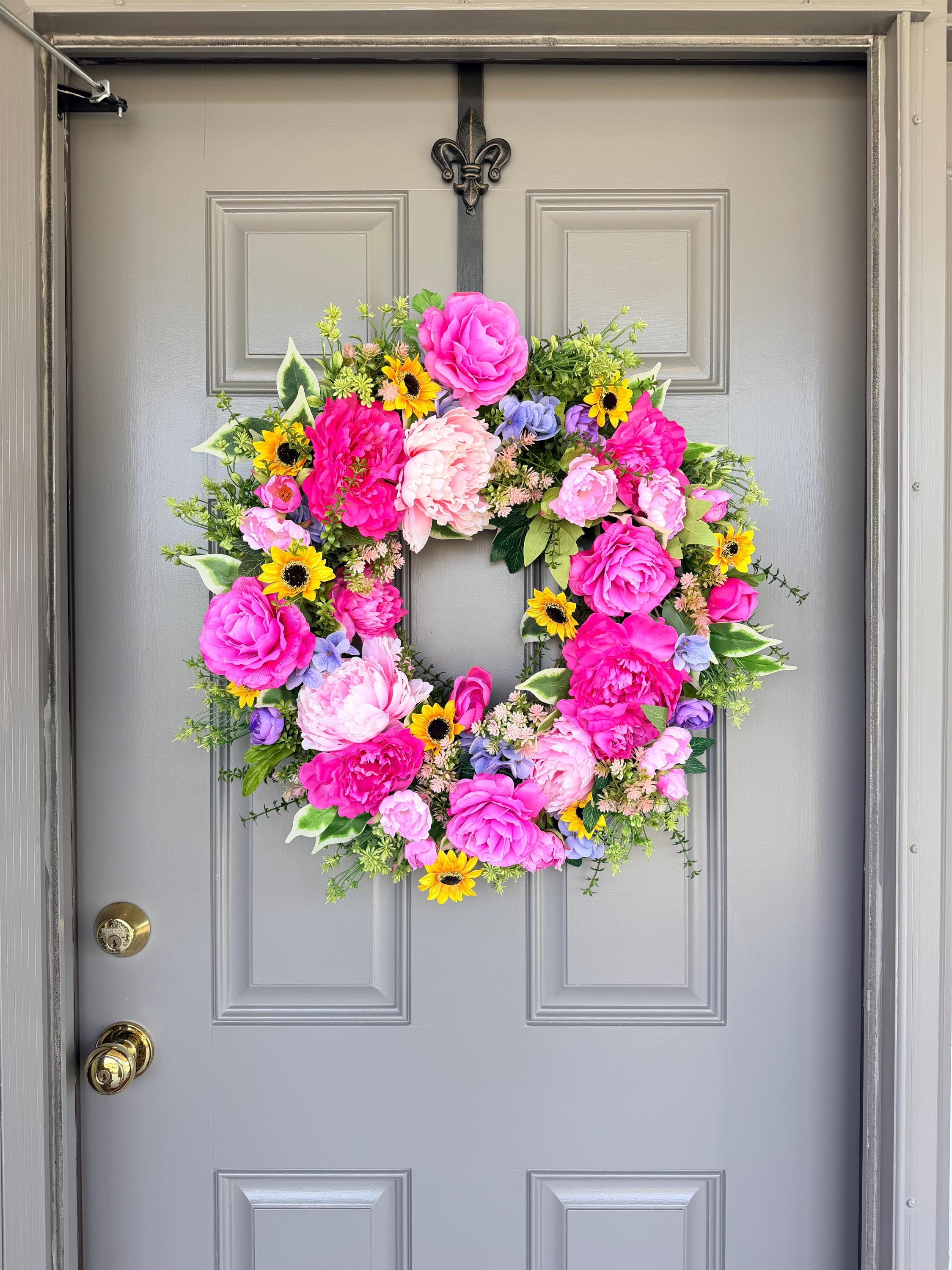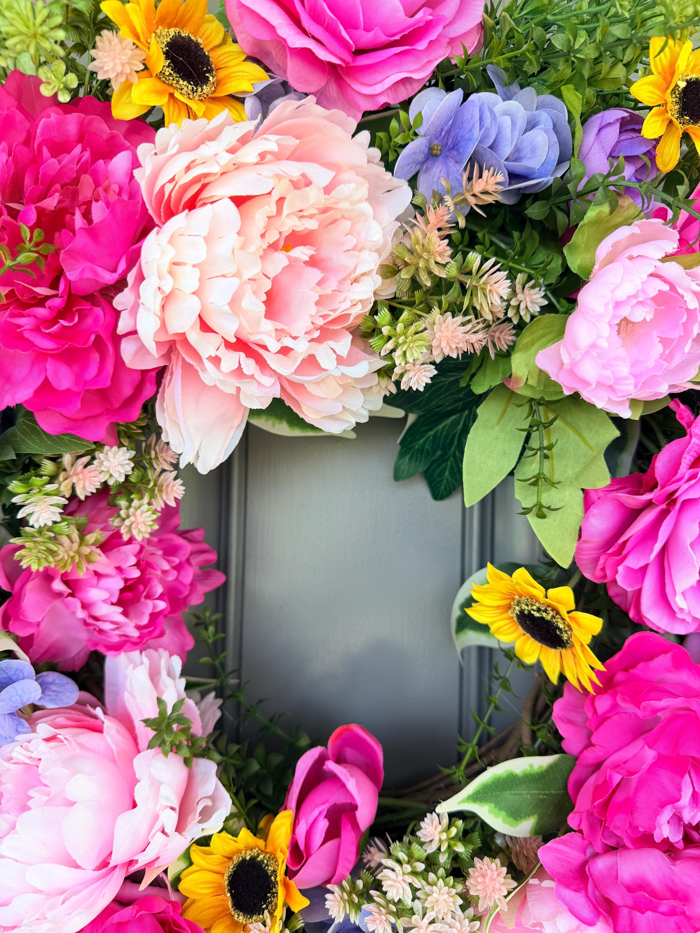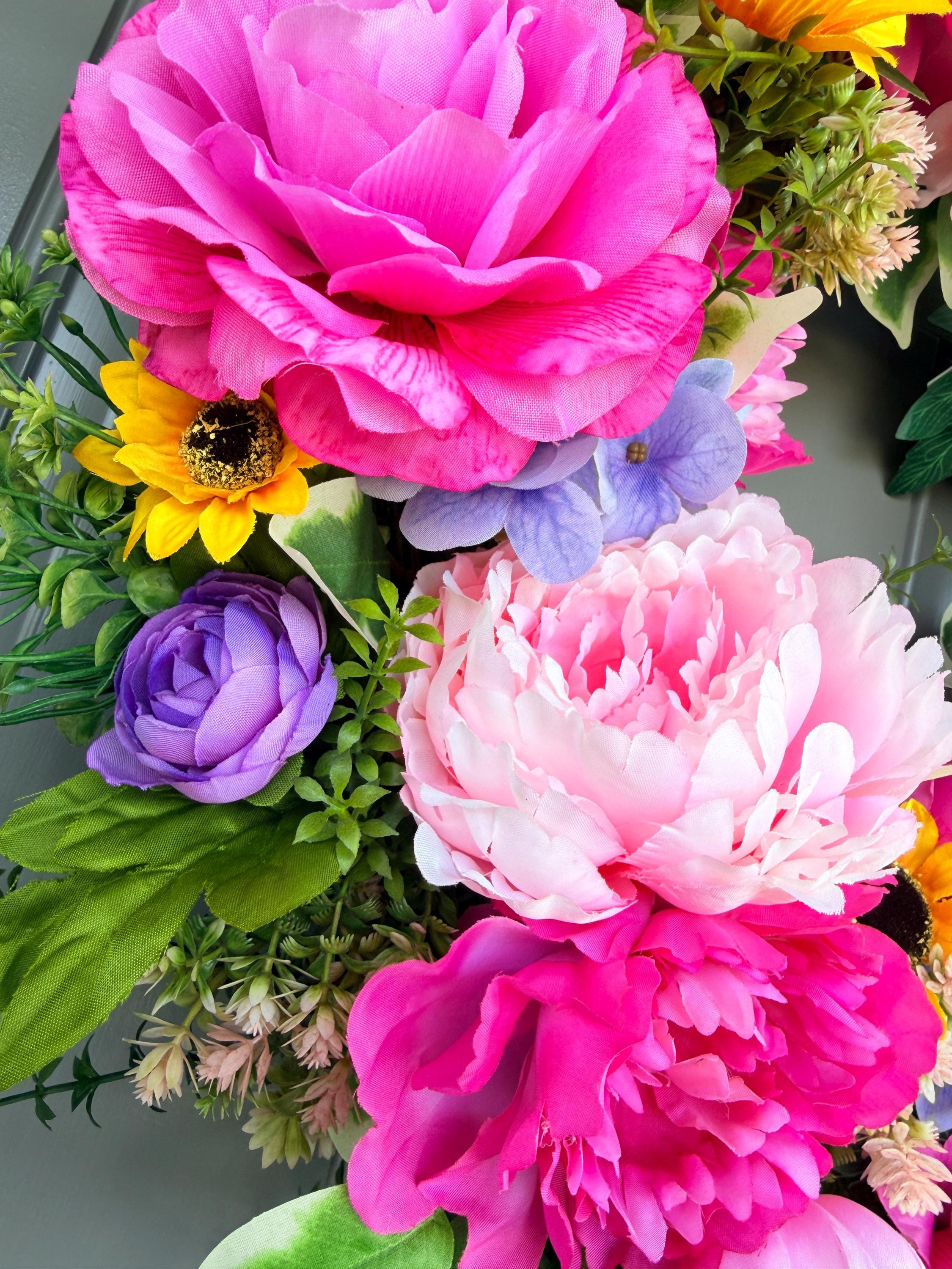 Pink peonies and ranunculus with soft greenery and succulent in a garden-inspired composition. Rich in texture and color, it brings a fresh, sophisticated charm to your front door or interior space. If you’re styling double doors, I’d be happy to create a coordinating pair—just reach out for a custom order.