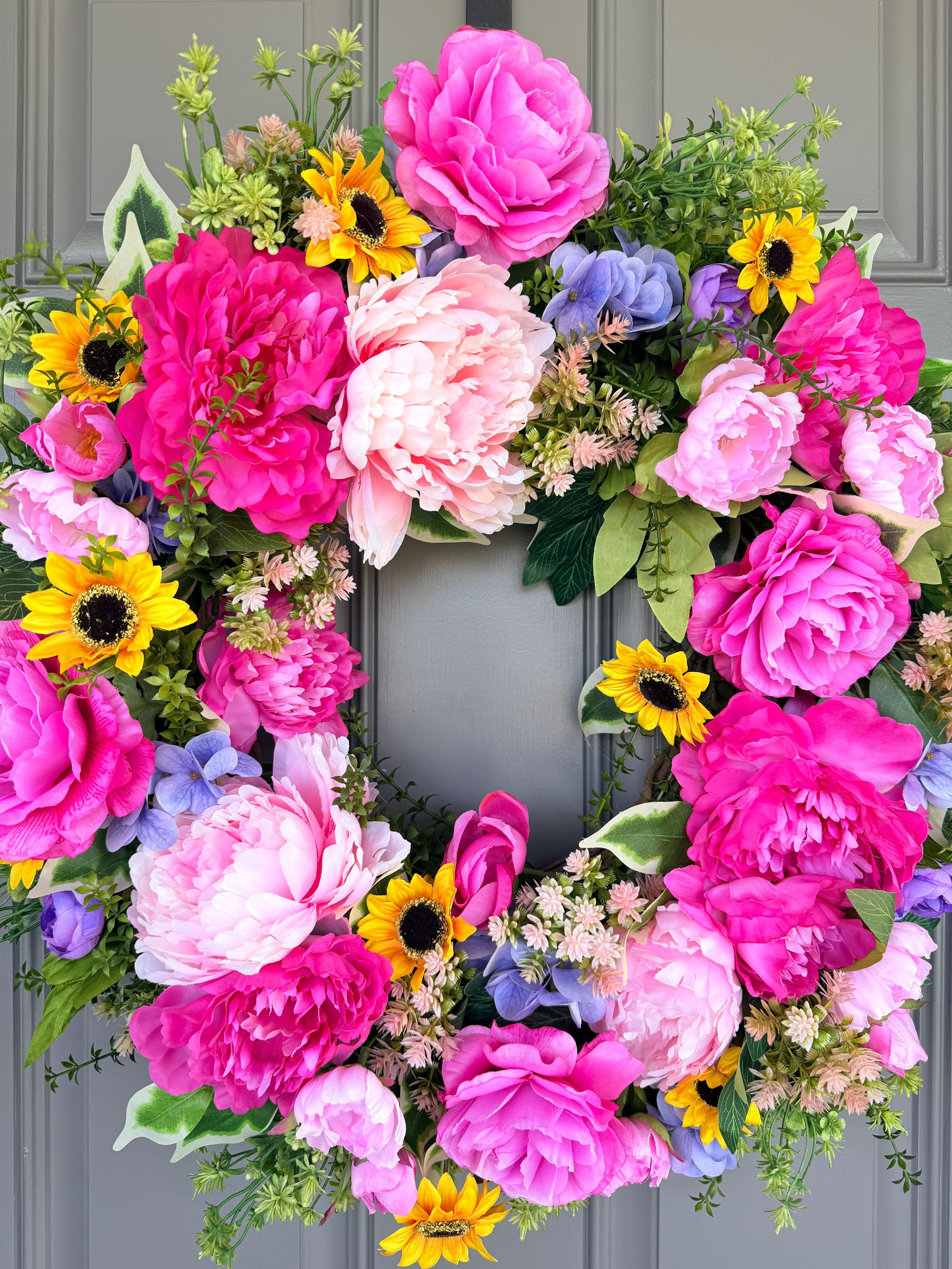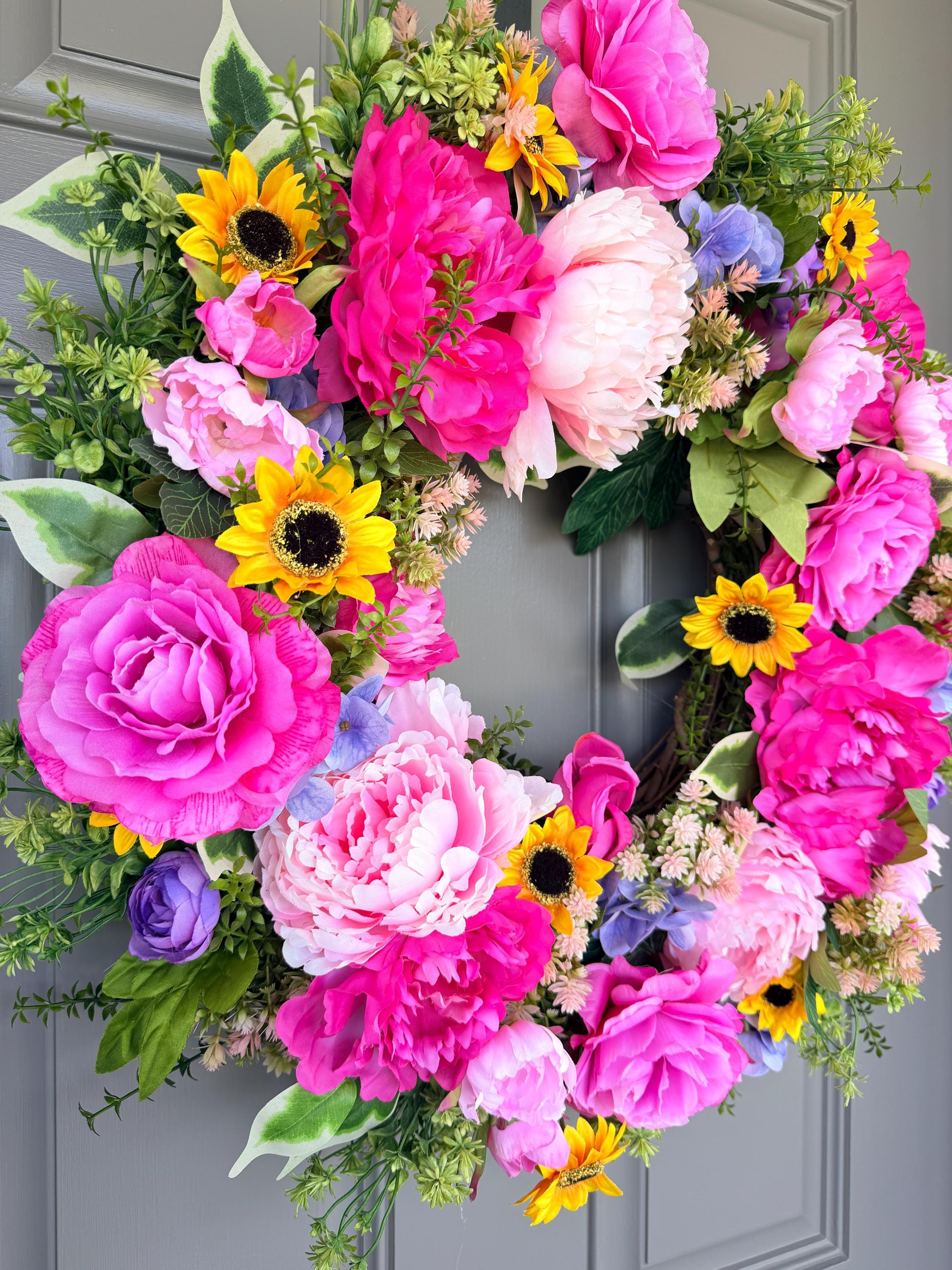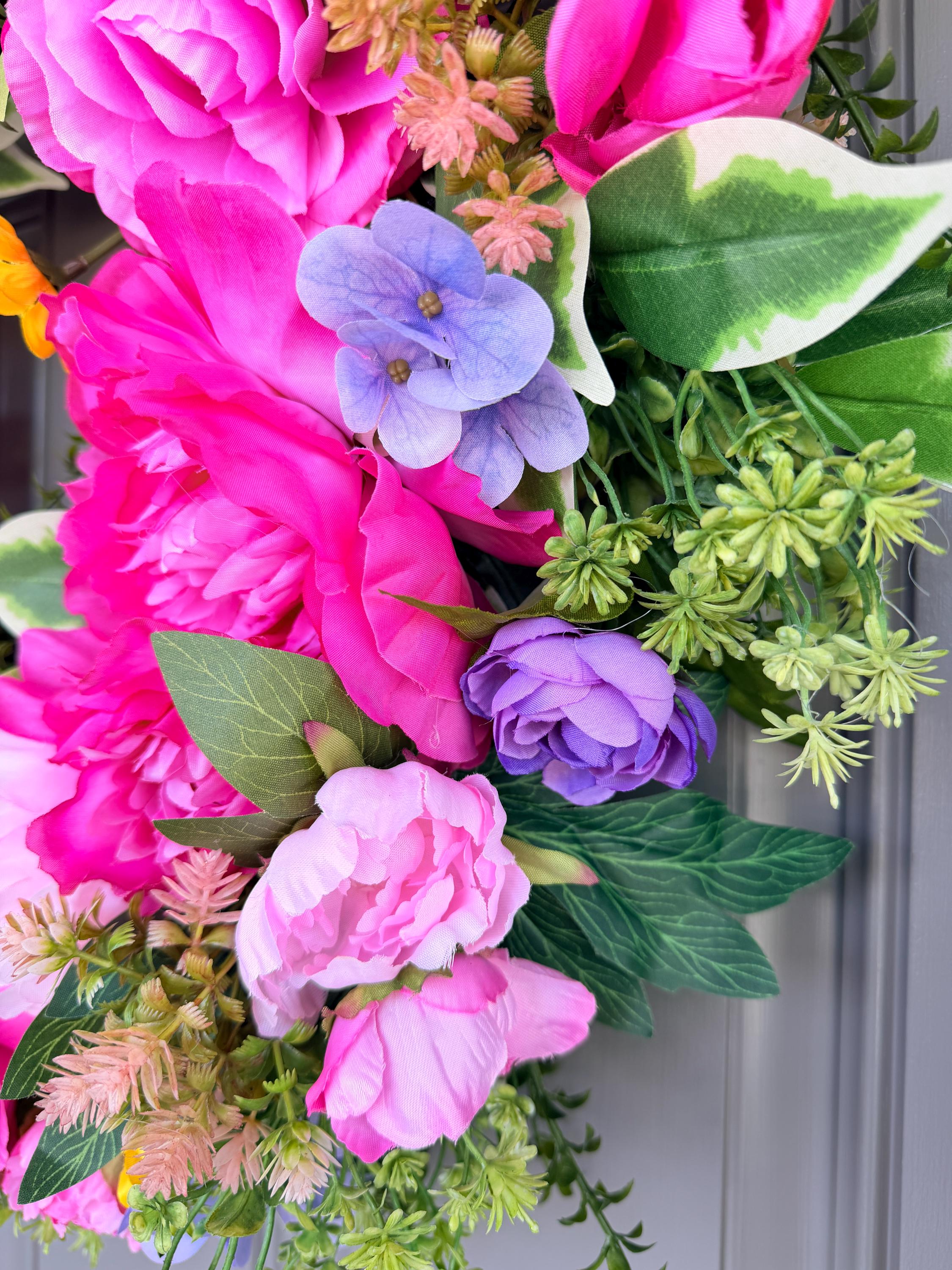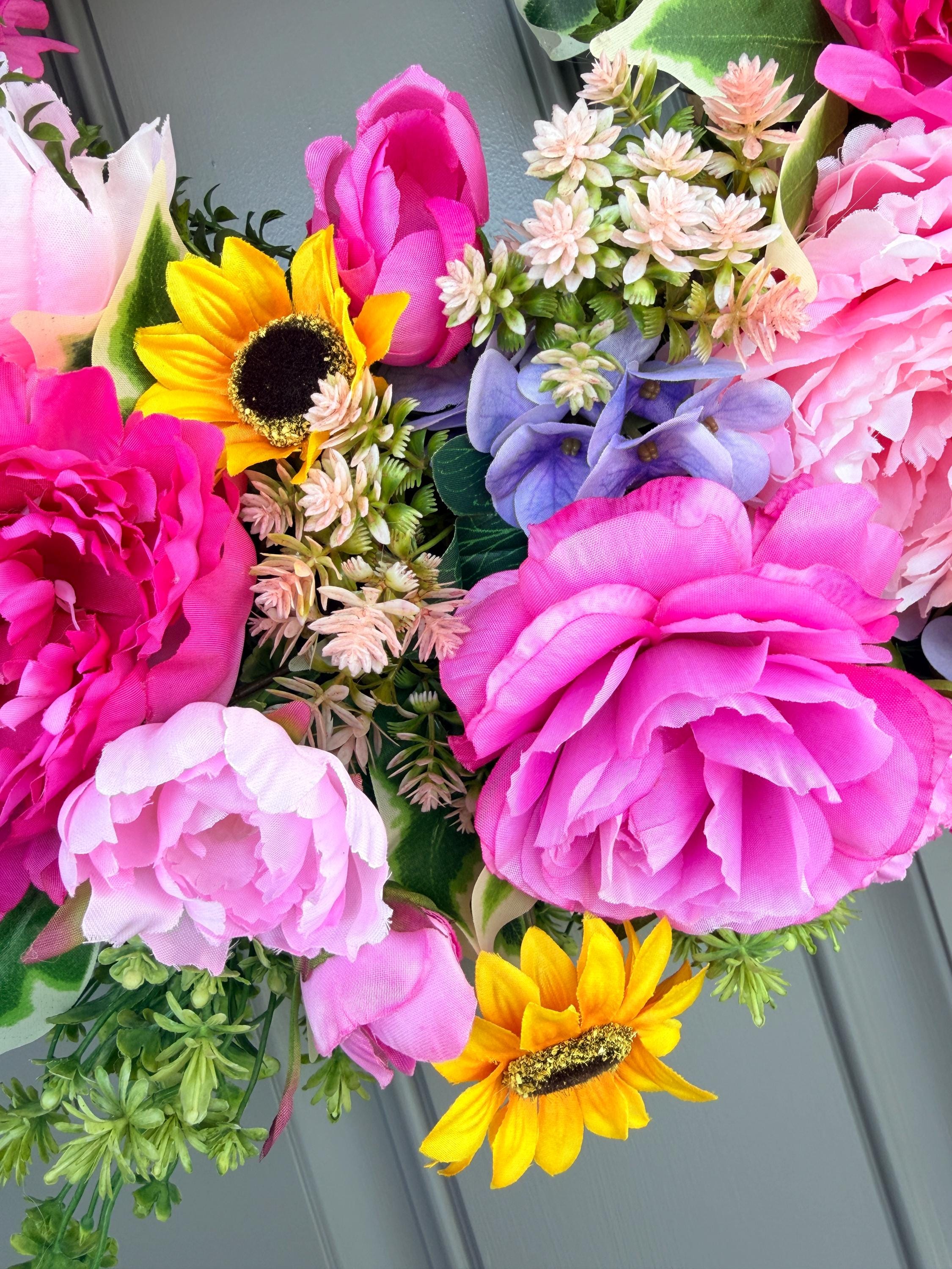 Pink peonies and ranunculus with soft greenery and succulent in a garden-inspired composition. Rich in texture and color, it brings a fresh, sophisticated charm to your front door or interior space. If you’re styling double doors, I’d be happy to create a coordinating pair—just reach out for a custom order.